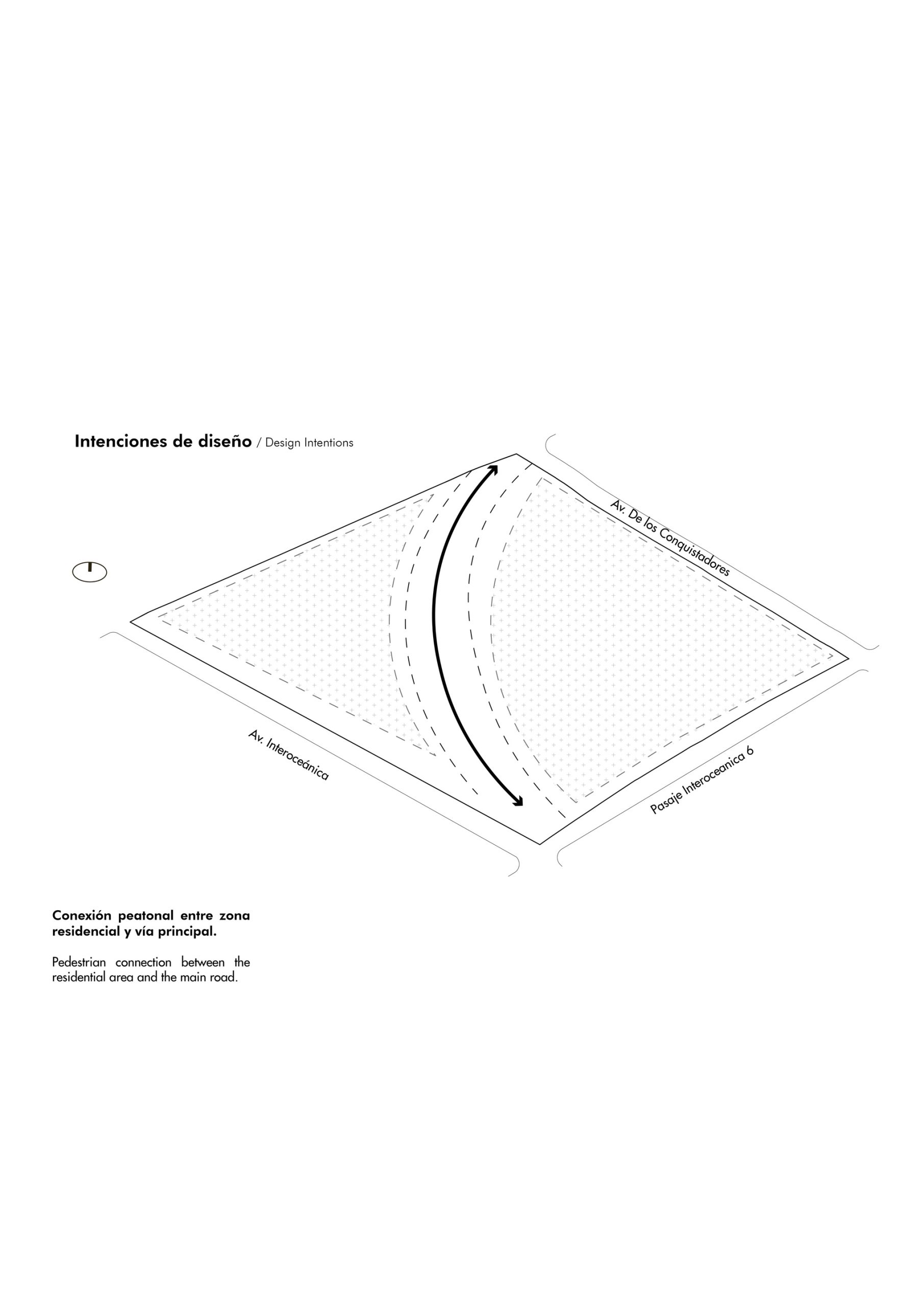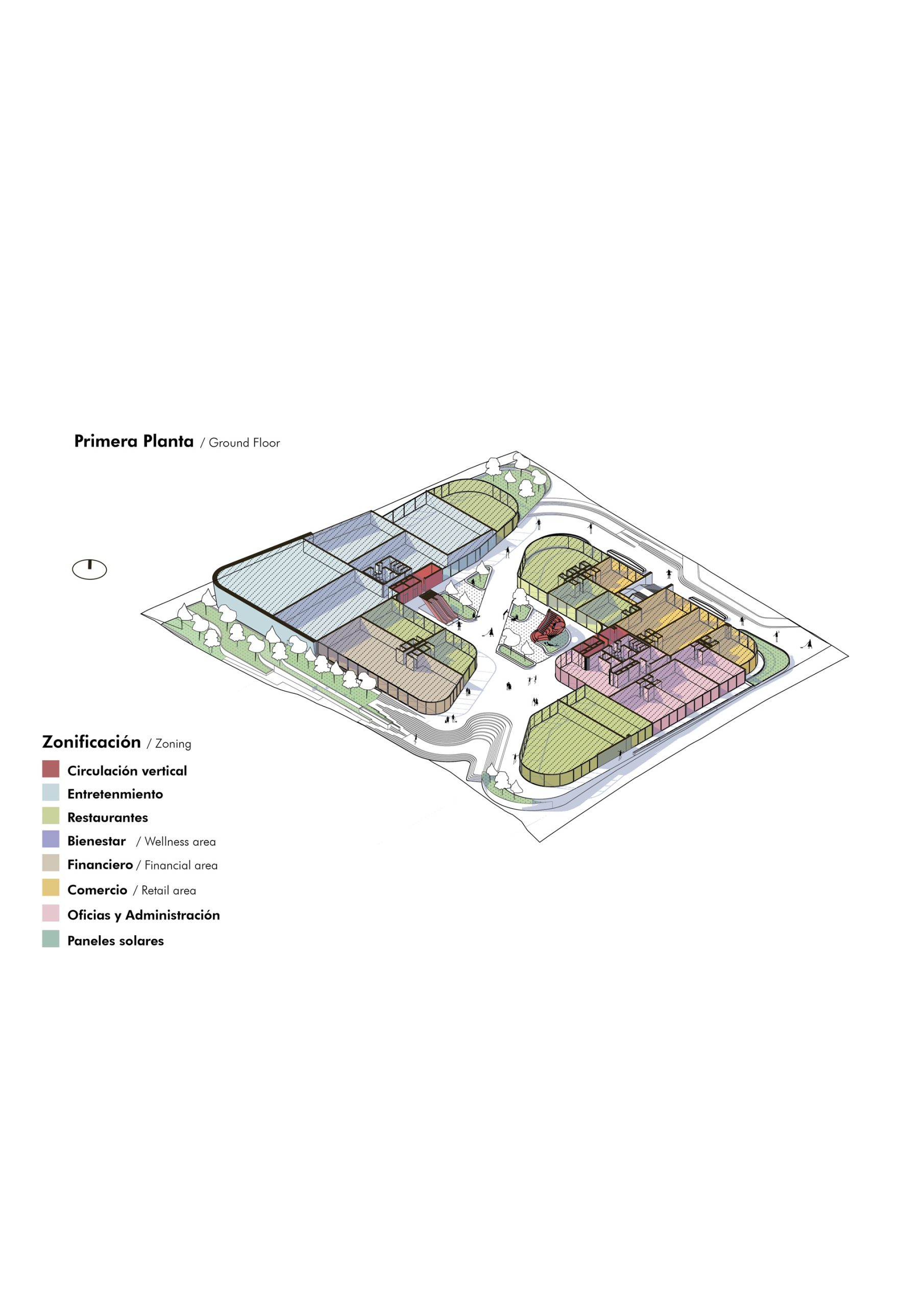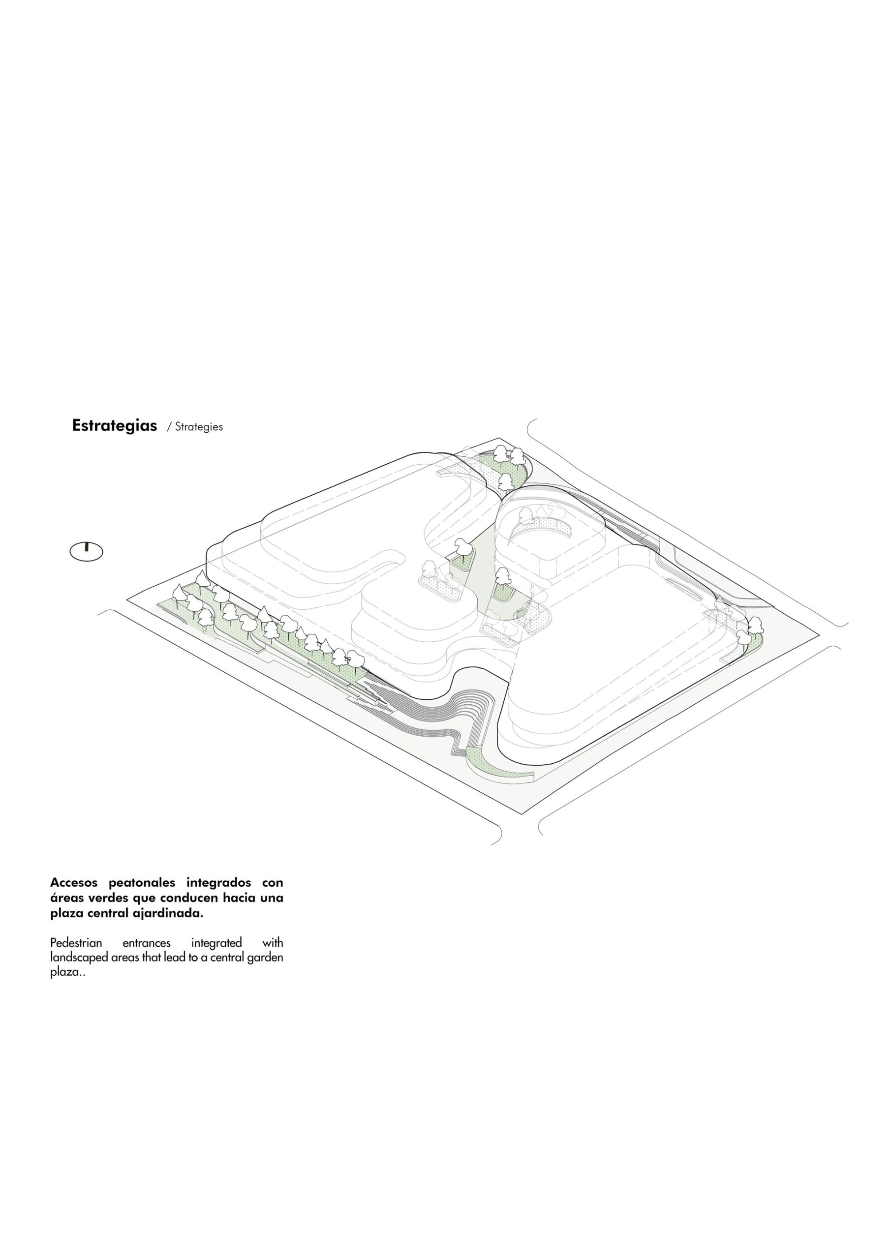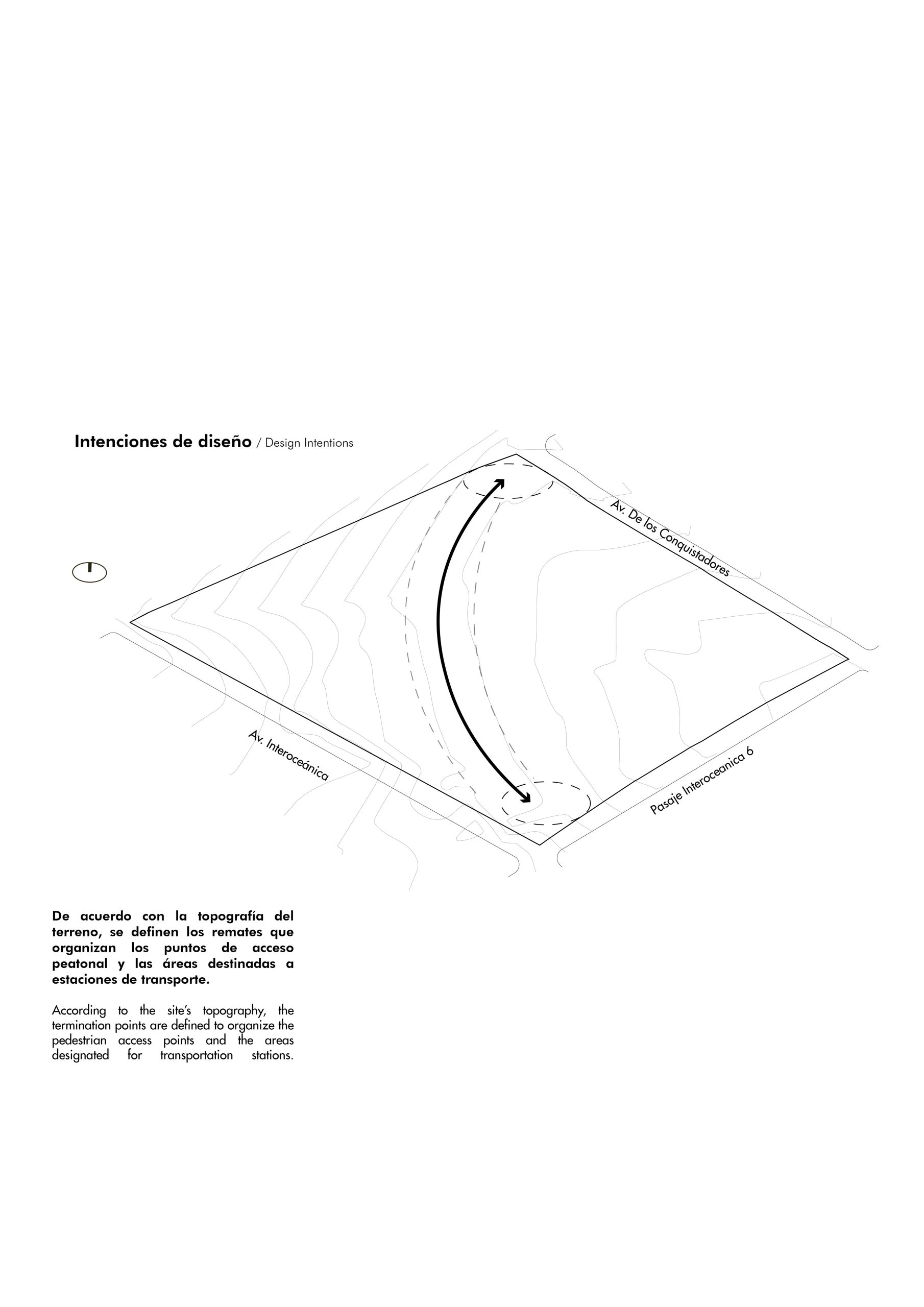 El concepto parte de reconocer y aprovechar la topografía natural del sitio, proponiendo una conexión peatonal a un solo nivel que vincula las dos vías principales del entorno mediante accesos en ambos extremos. Esta estrategia de circulación conduce a una plaza central concebida como un núcleo social activo, enmarcado por restaurantes y locales comerciales en planta baja. Dentro de este espacio se incorpora un graderío orientado hacia grandes pantallas, permitiendo la realización de eventos al aire libre y funcionando como un punto de encuentro flexible y de múltiples usos.