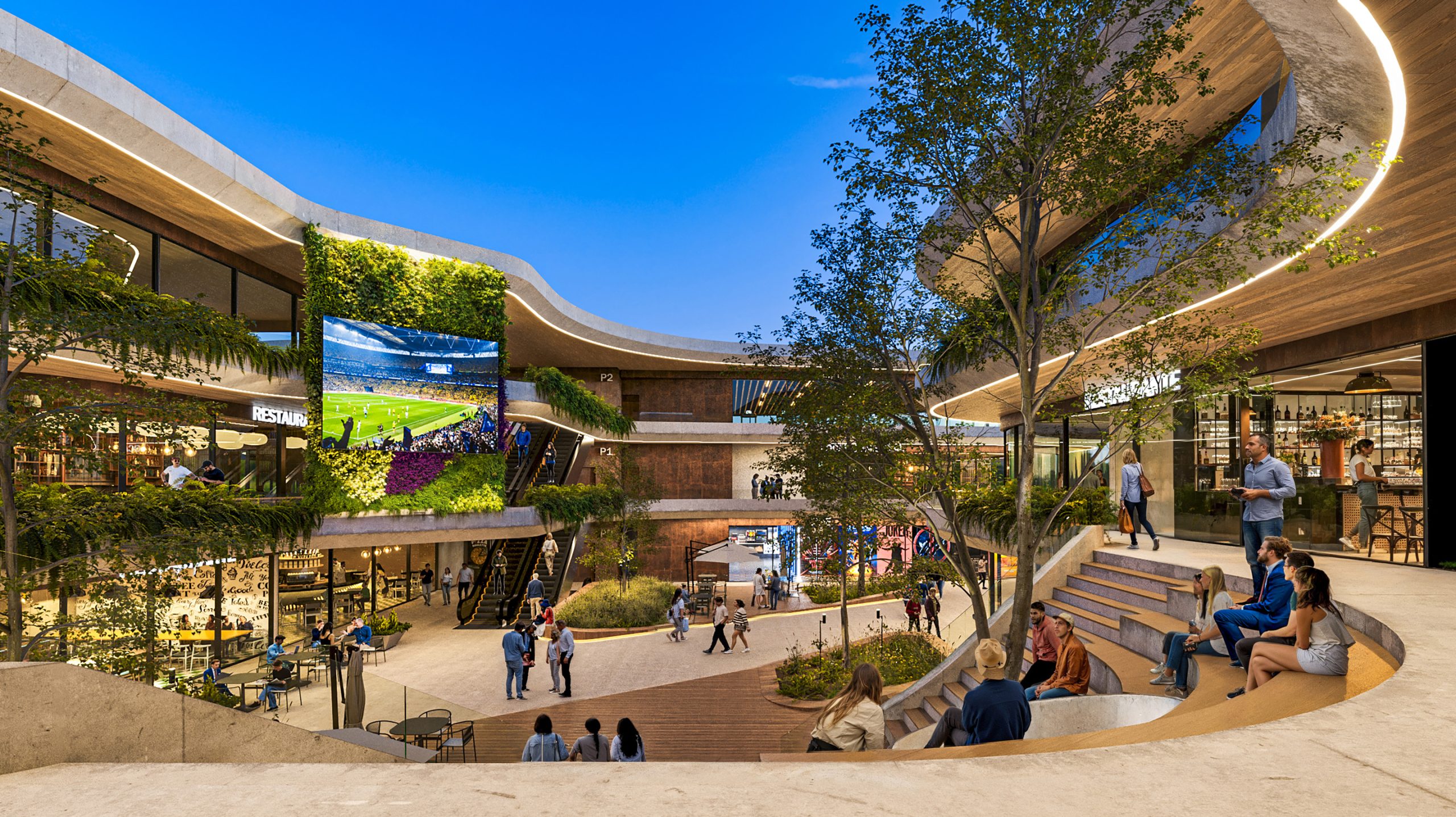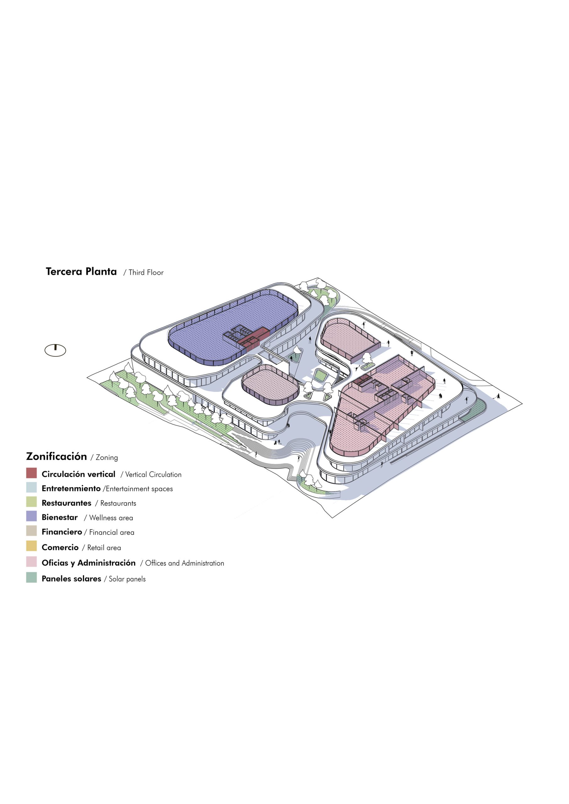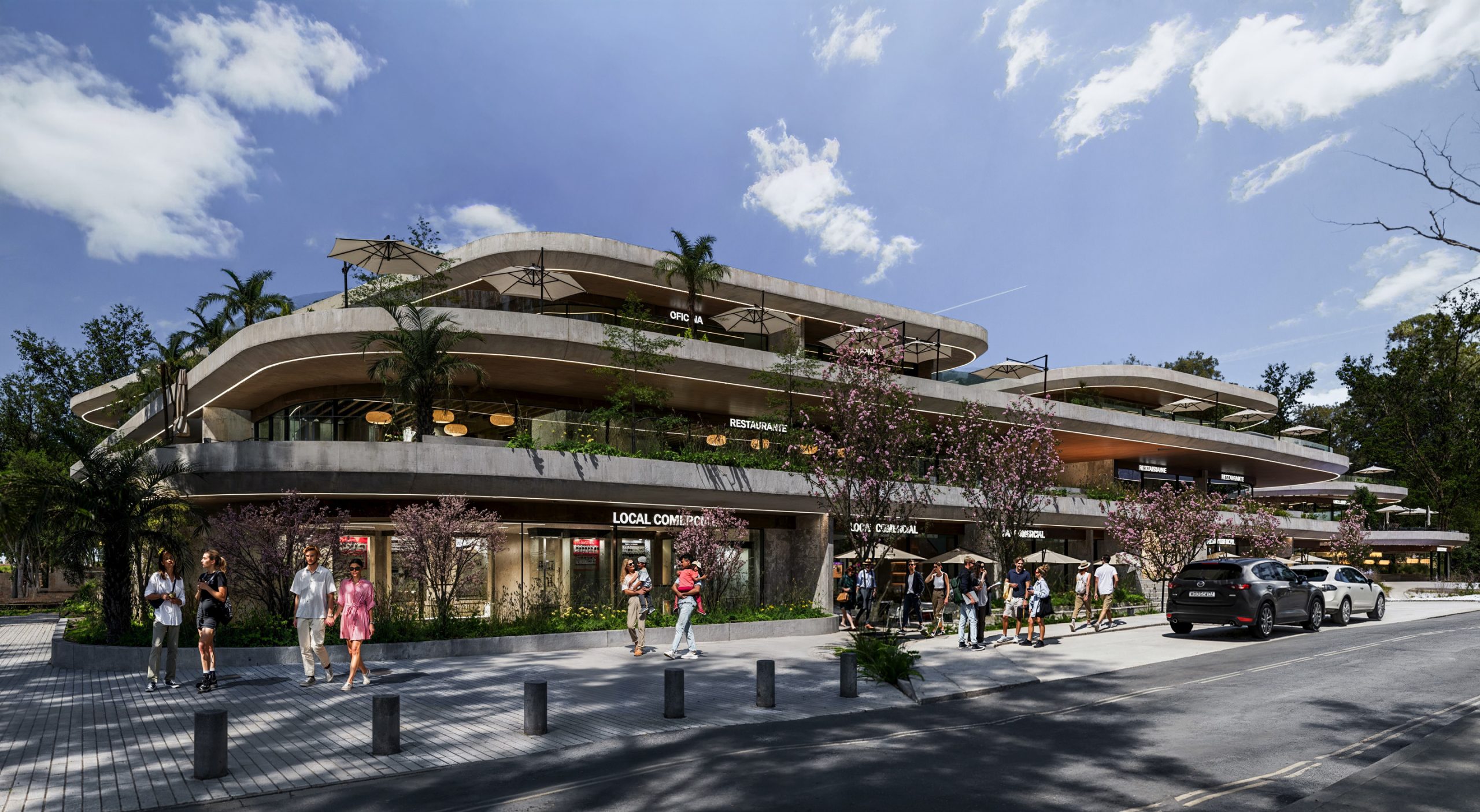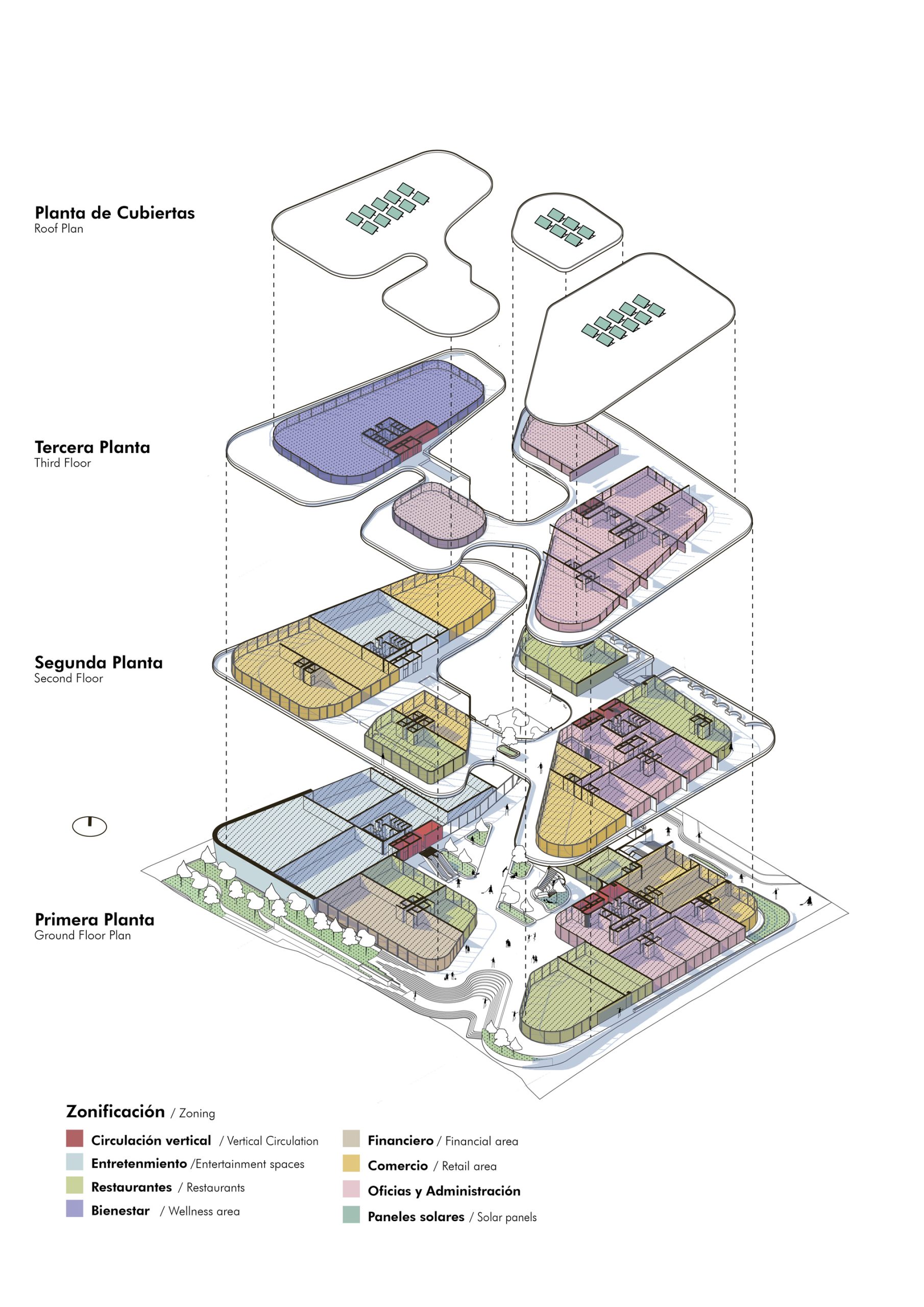 El concepto parte de reconocer y aprovechar la topografía natural del sitio, proponiendo una conexión peatonal a un solo nivel que vincula las dos vías principales del entorno mediante accesos en ambos extremos. Esta estrategia de circulación conduce a una plaza central concebida como un núcleo social activo, enmarcado por restaurantes y locales comerciales en planta baja. Dentro de este espacio se incorpora un graderío orientado hacia grandes pantallas, permitiendo la realización de eventos al aire libre y funcionando como un punto de encuentro flexible y de múltiples usos.