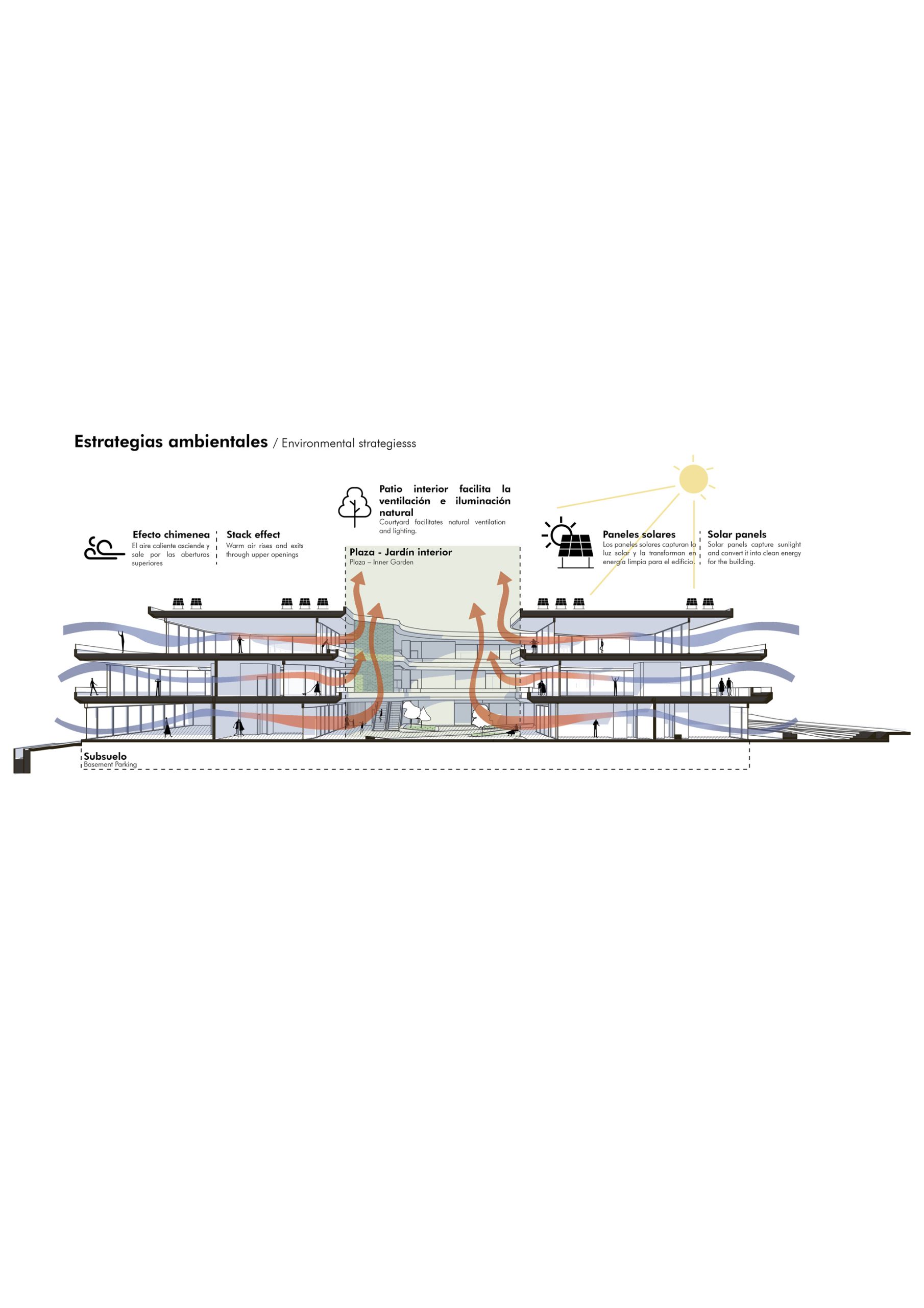 Hacia el exterior, el proyecto dialoga de manera cuidadosa con su contexto urbano, abriéndose tanto a los flujos de transporte público como privado y colocando la experiencia del usuario en el centro del diseño espacial y de las circulaciones.