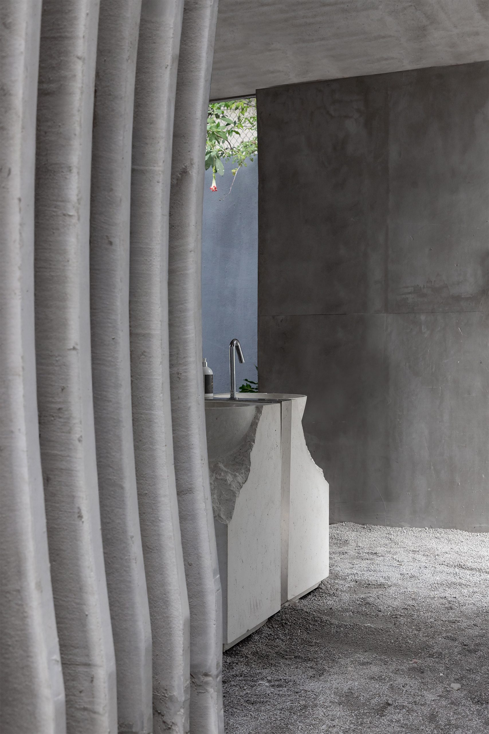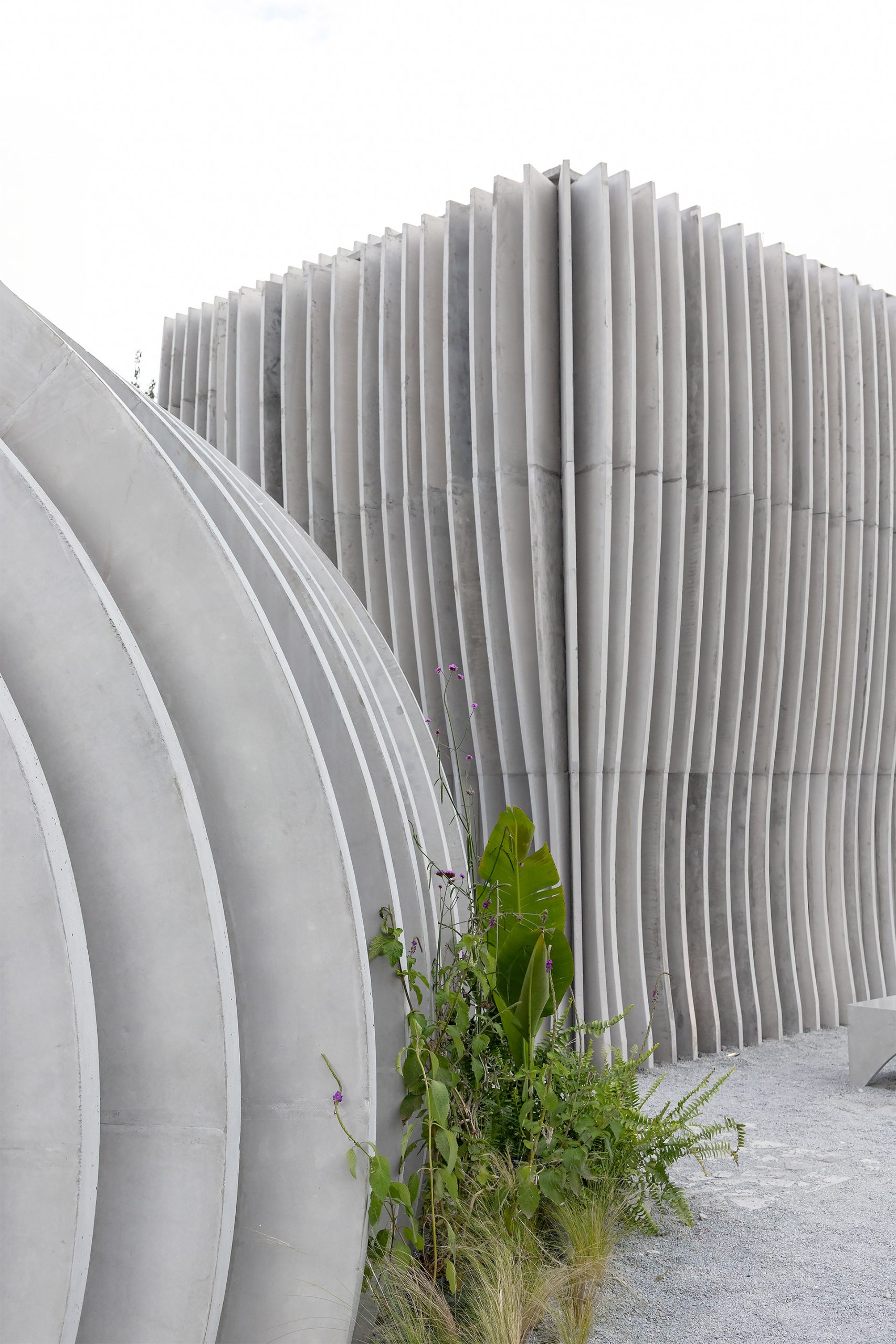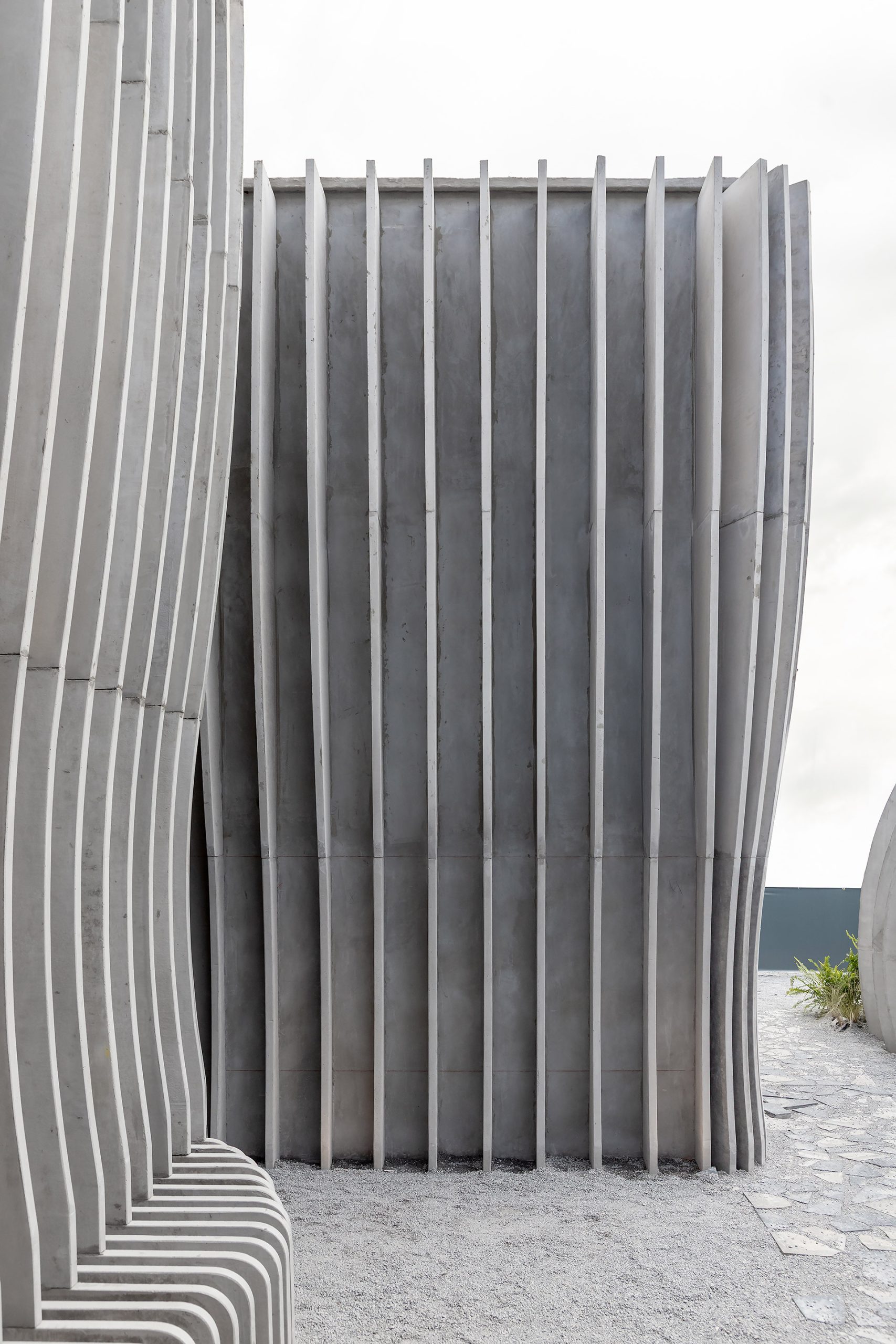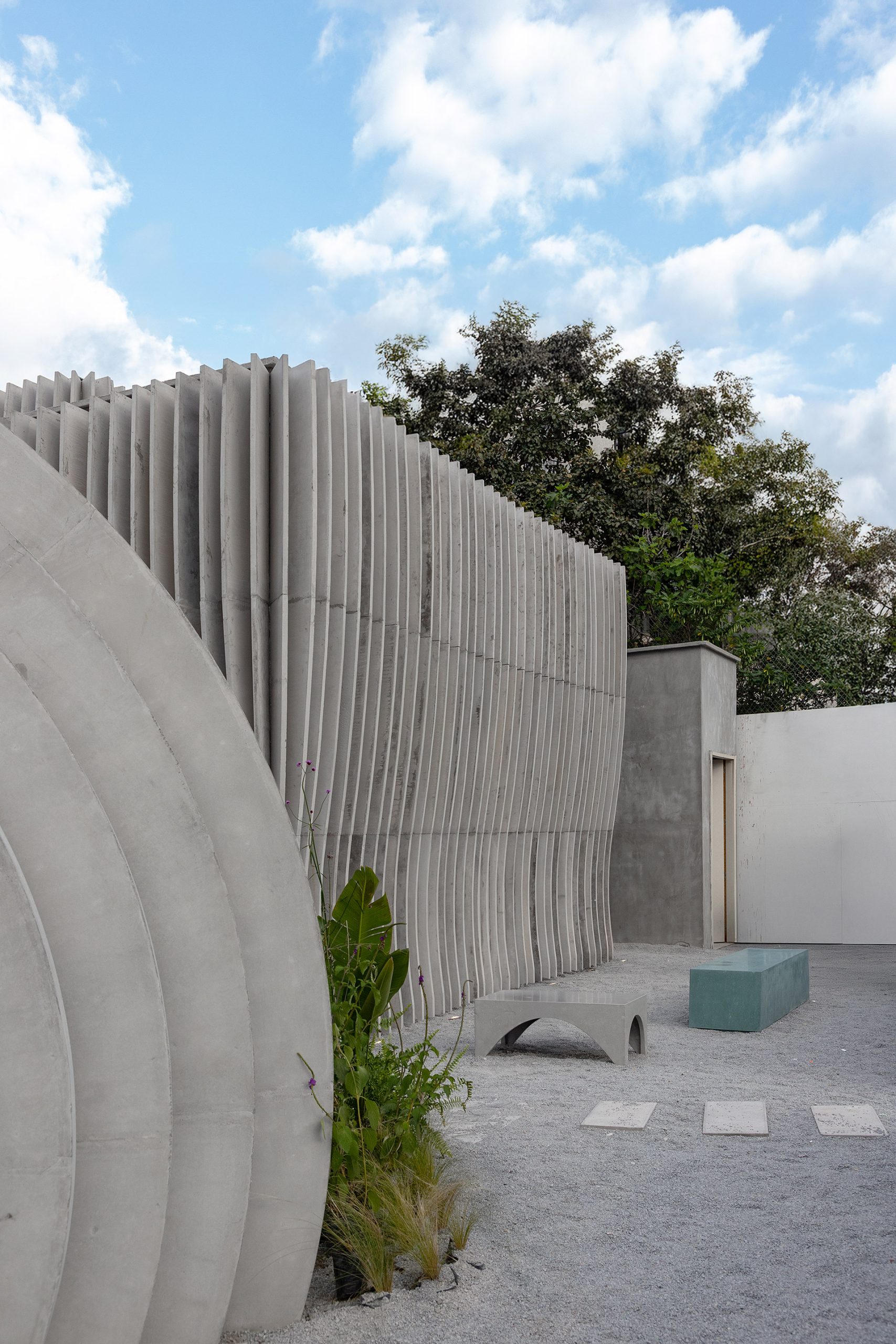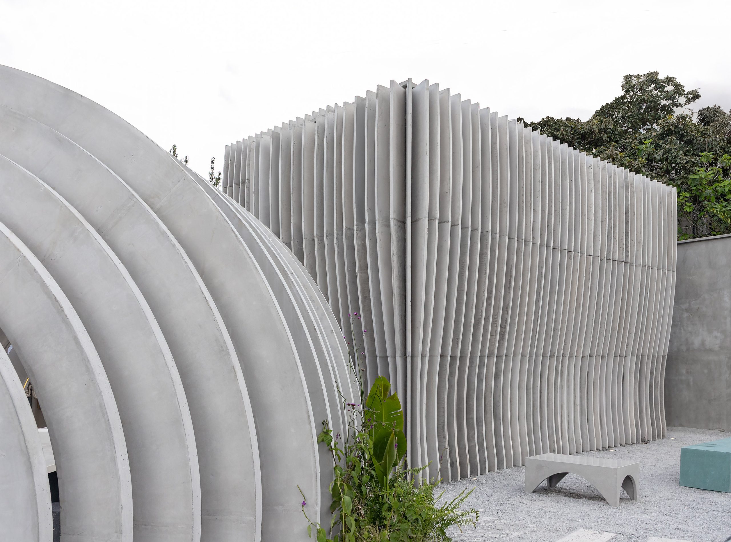 Se fabricaron más de 431 piezas de hormigón diseñadas a medida para crear una fachada paramétrica concebida como una piel escultórica: un envolvente brutalista y orgánica que busca congelar el instante de la fundición y expresar el origen fluido del hormigón. Este exterior gris contrasta con los interiores vibrantes, definidos por vegetación abundante y paletas de colores dinámicas. Varios de los espacios interiores se mantuvieron abiertos al cielo, permitiendo que la luz natural, el clima y la hora del día modelen activamente la experiencia del usuario.