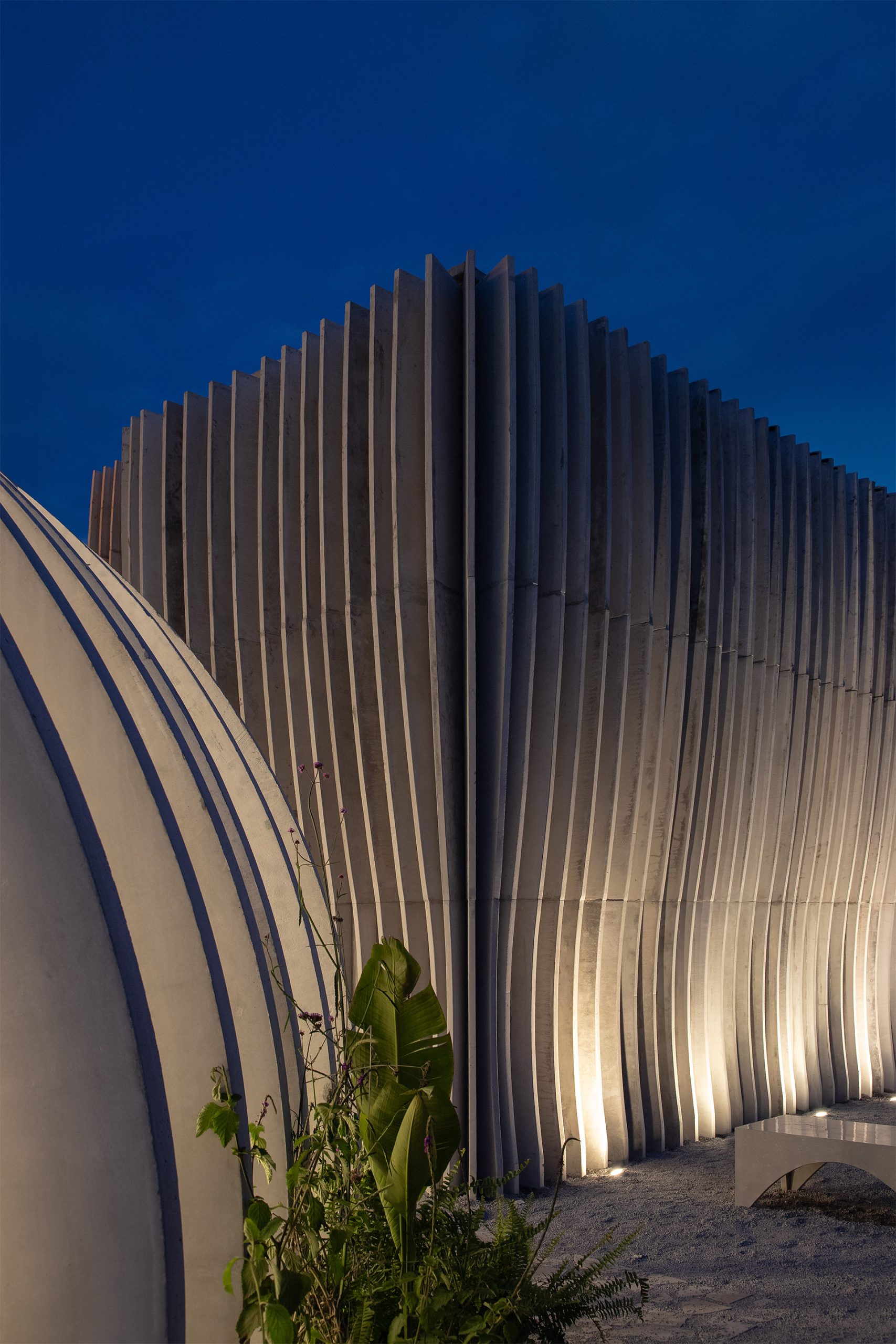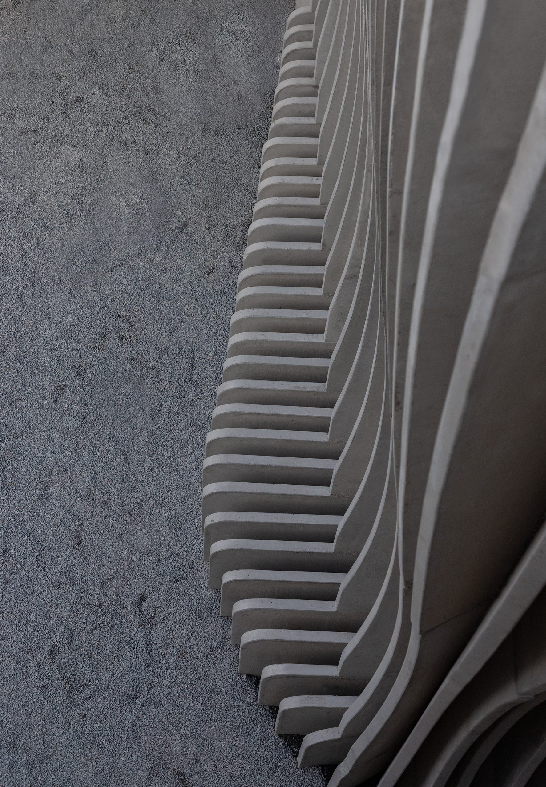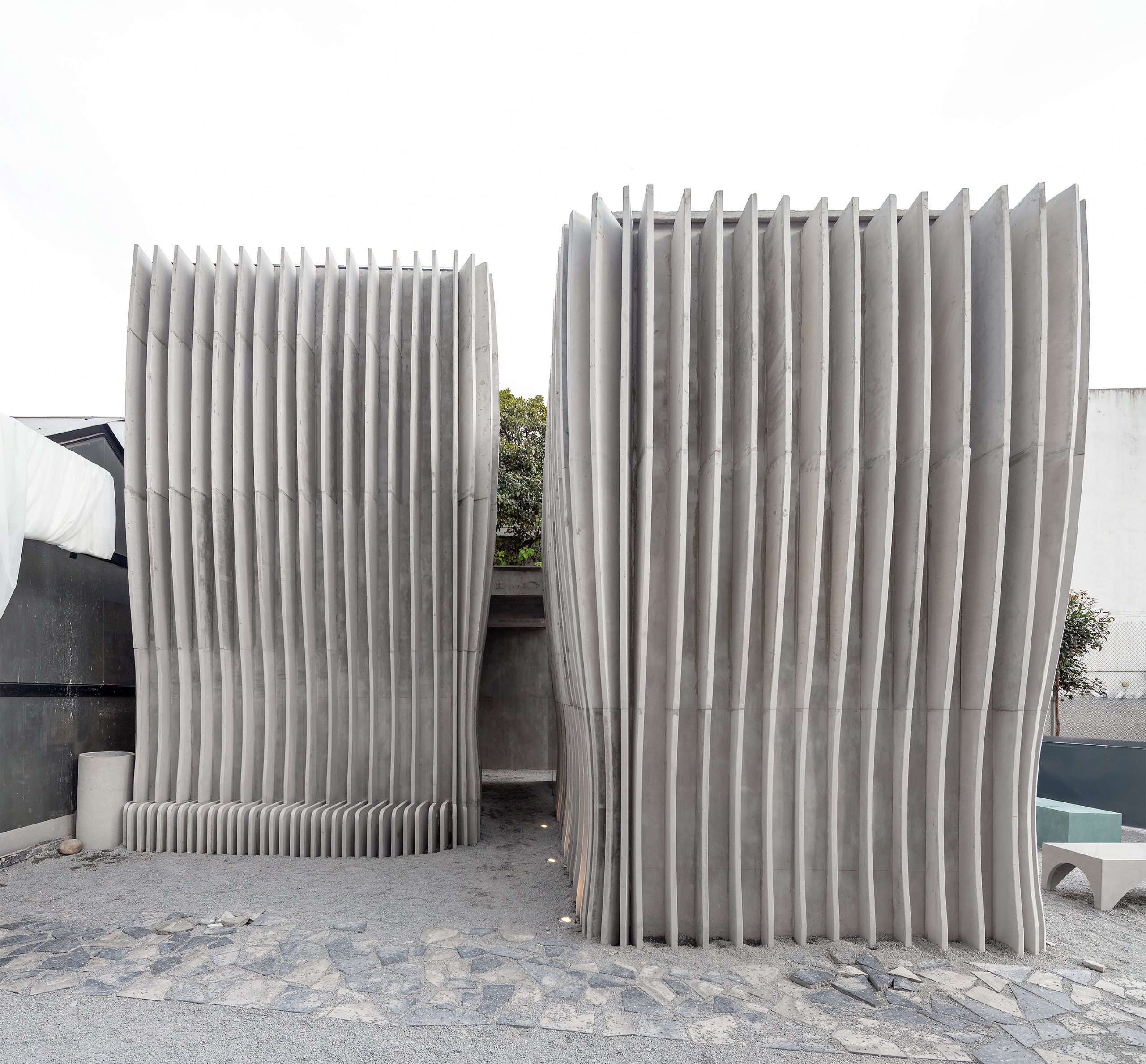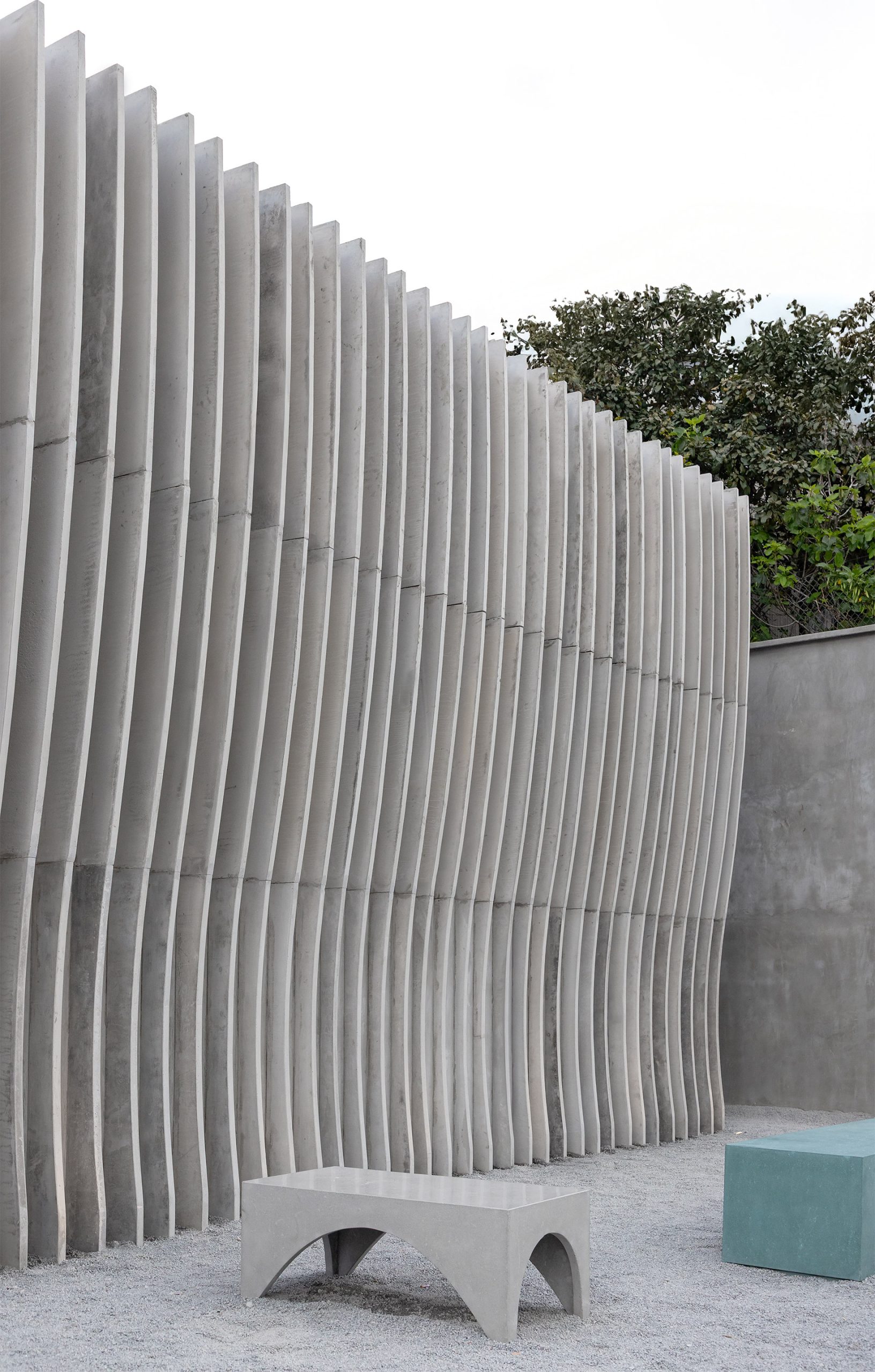 Se fabricaron más de 431 piezas de hormigón diseñadas a medida para crear una fachada paramétrica concebida como una piel escultórica: un envolvente brutalista y orgánica que busca congelar el instante de la fundición y expresar el origen fluido del hormigón. Este exterior gris contrasta con los interiores vibrantes, definidos por vegetación abundante y paletas de colores dinámicas. Varios de los espacios interiores se mantuvieron abiertos al cielo, permitiendo que la luz natural, el clima y la hora del día modelen activamente la experiencia del usuario.