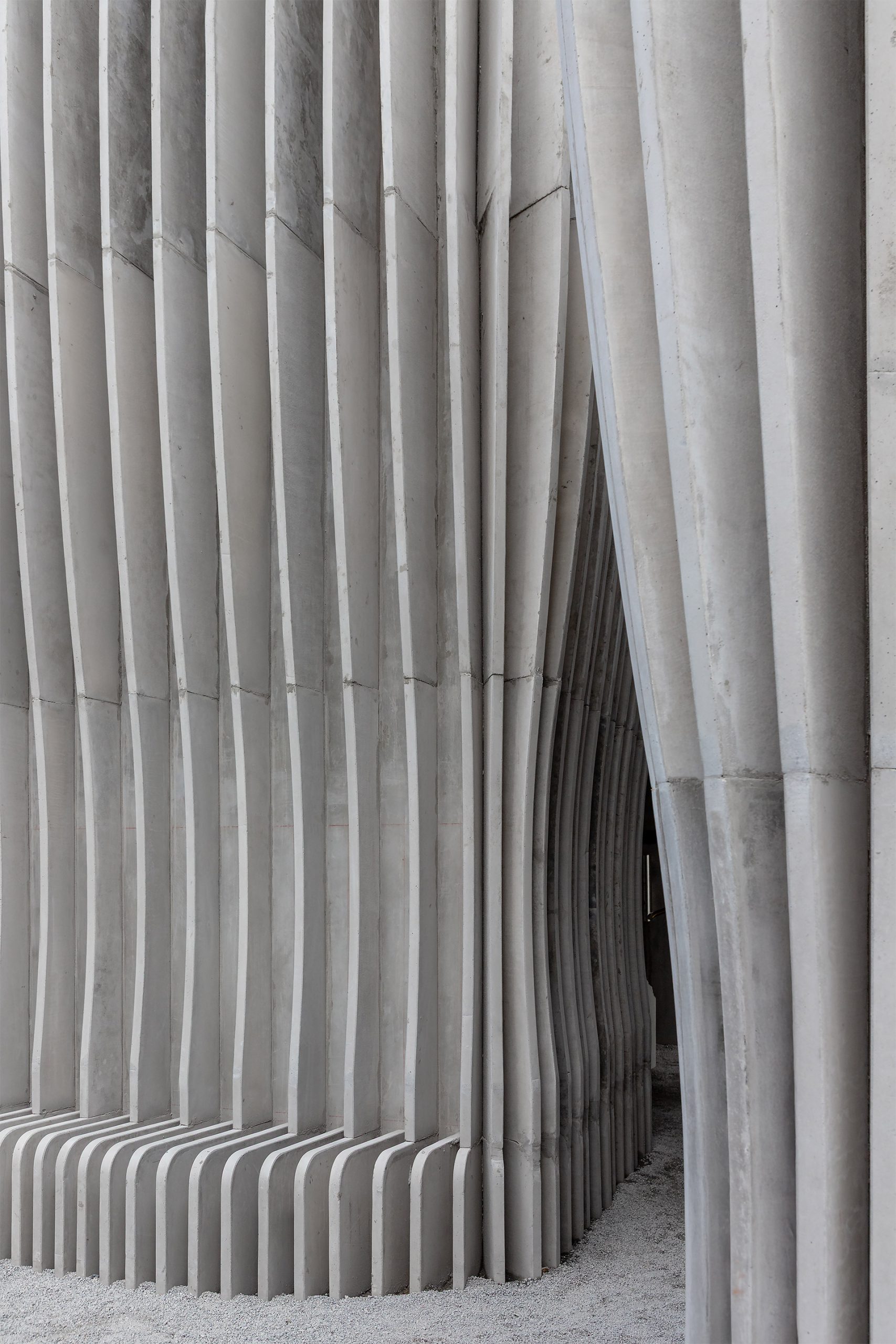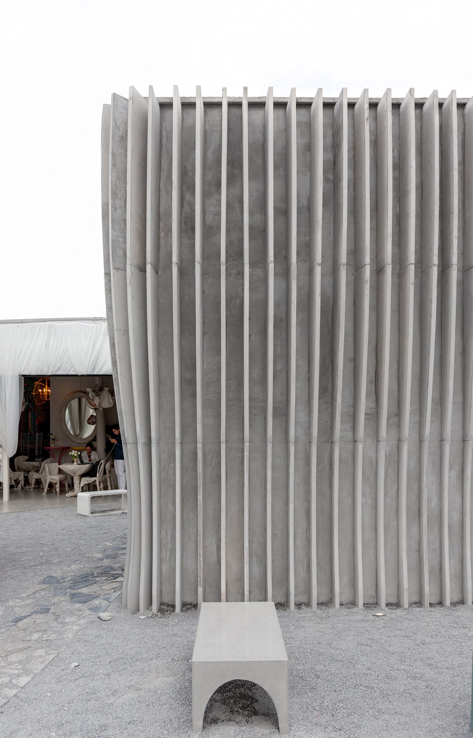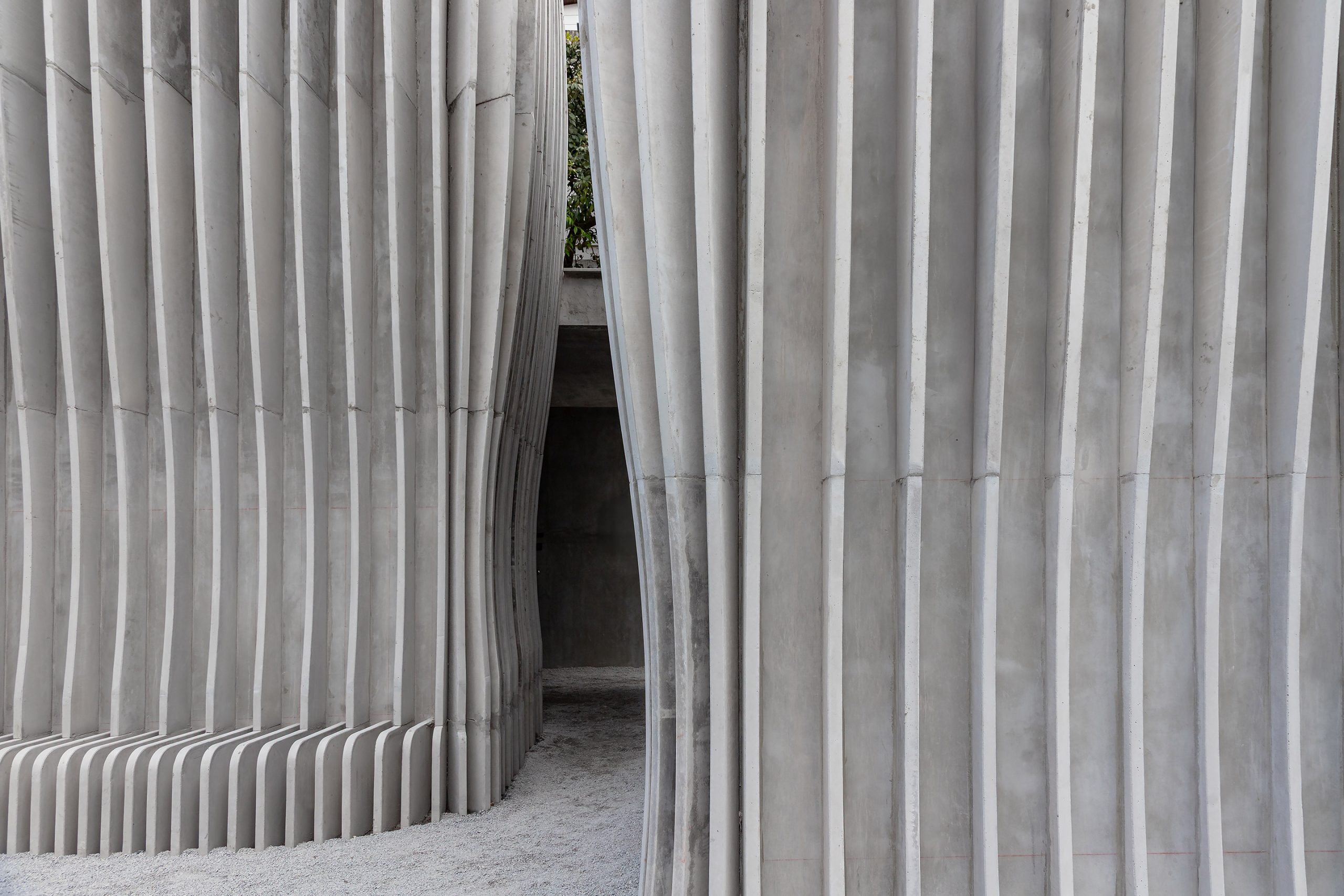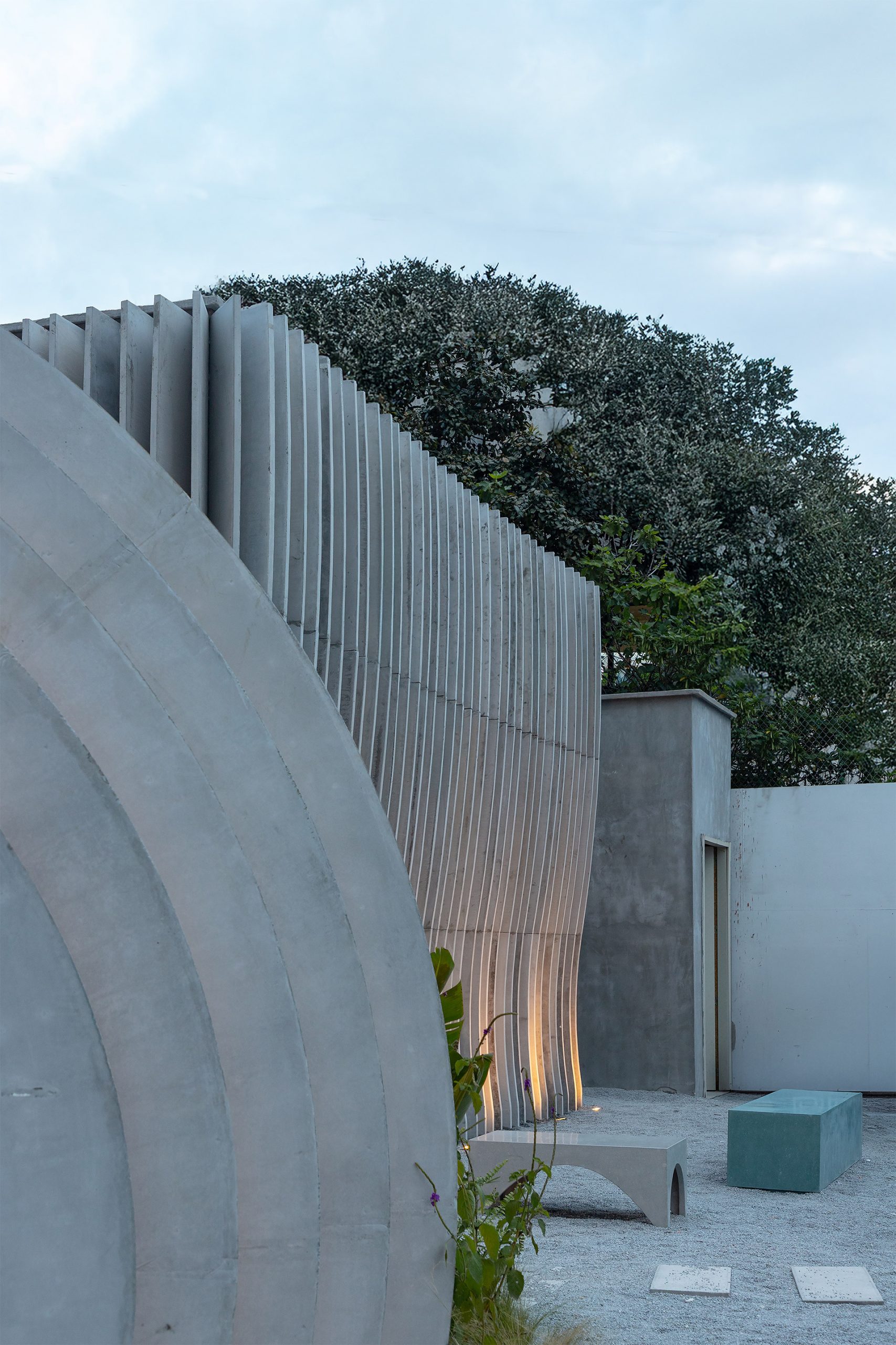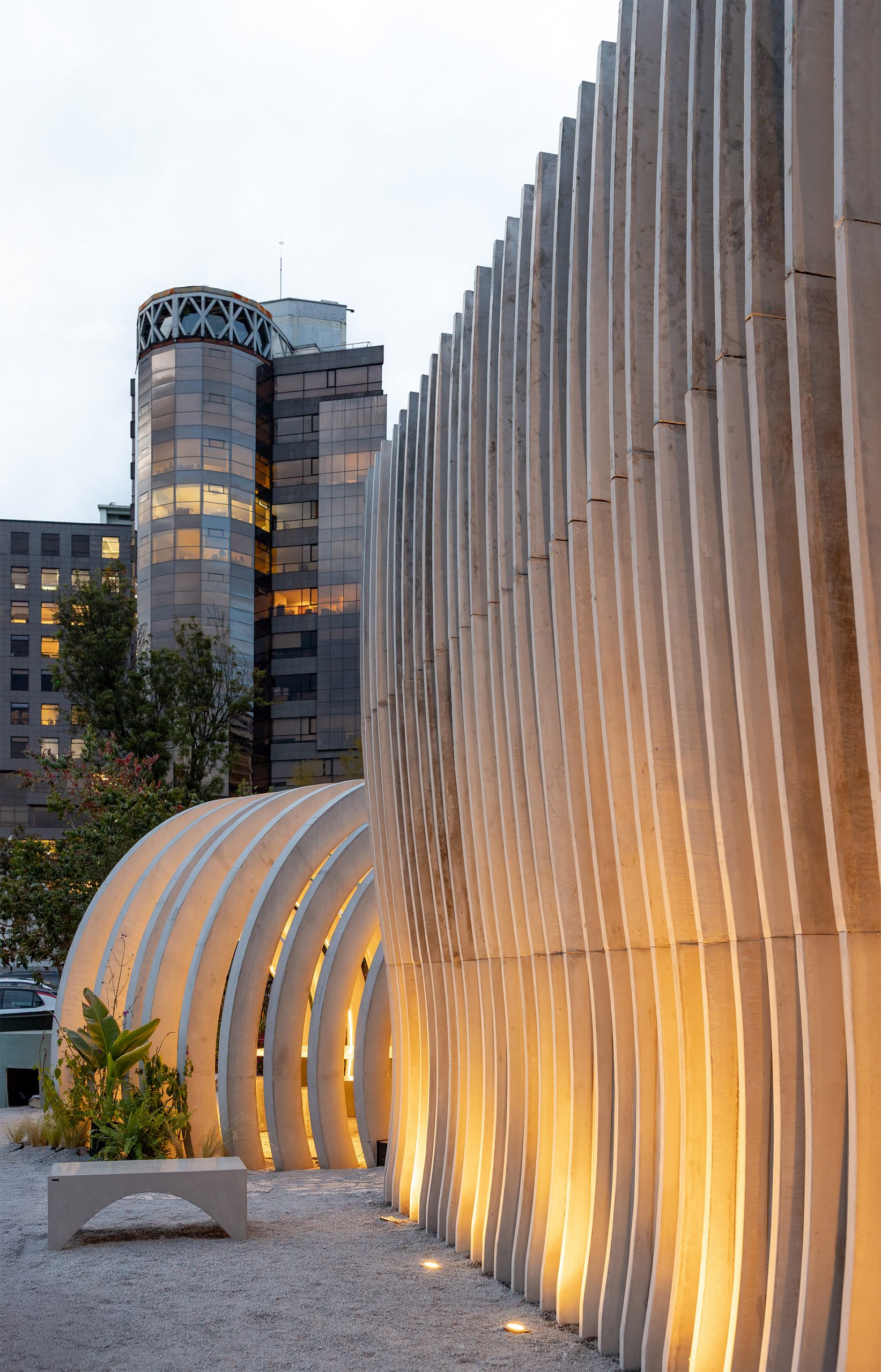 Se fabricaron más de 431 piezas de hormigón diseñadas a medida para crear una fachada paramétrica concebida como una piel escultórica: un envolvente brutalista y orgánica que busca congelar el instante de la fundición y expresar el origen fluido del hormigón. Este exterior gris contrasta con los interiores vibrantes, definidos por vegetación abundante y paletas de colores dinámicas. Varios de los espacios interiores se mantuvieron abiertos al cielo, permitiendo que la luz natural, el clima y la hora del día modelen activamente la experiencia del usuario.