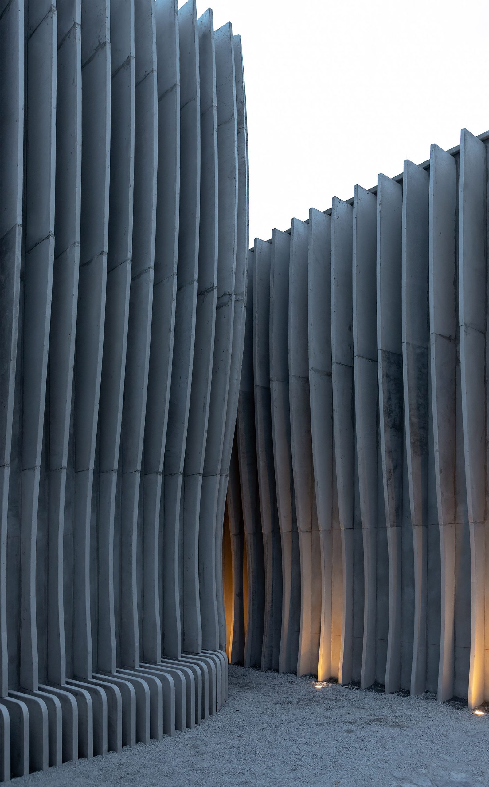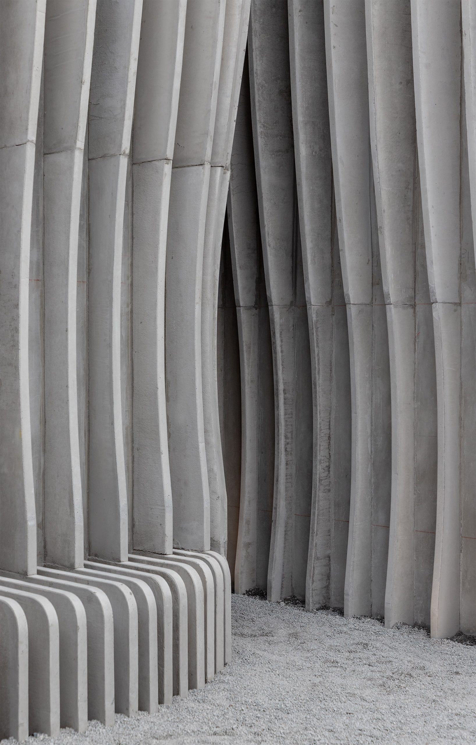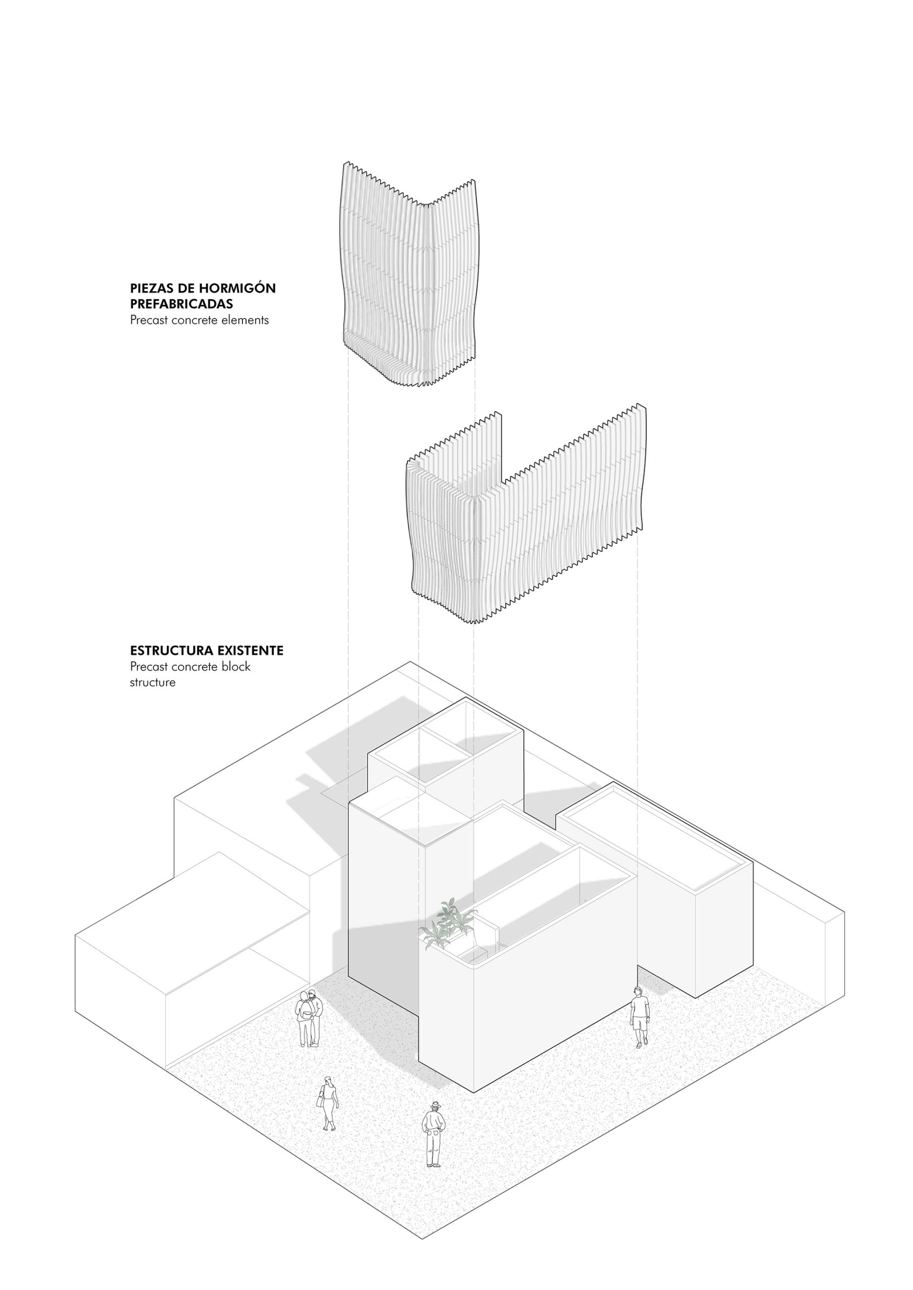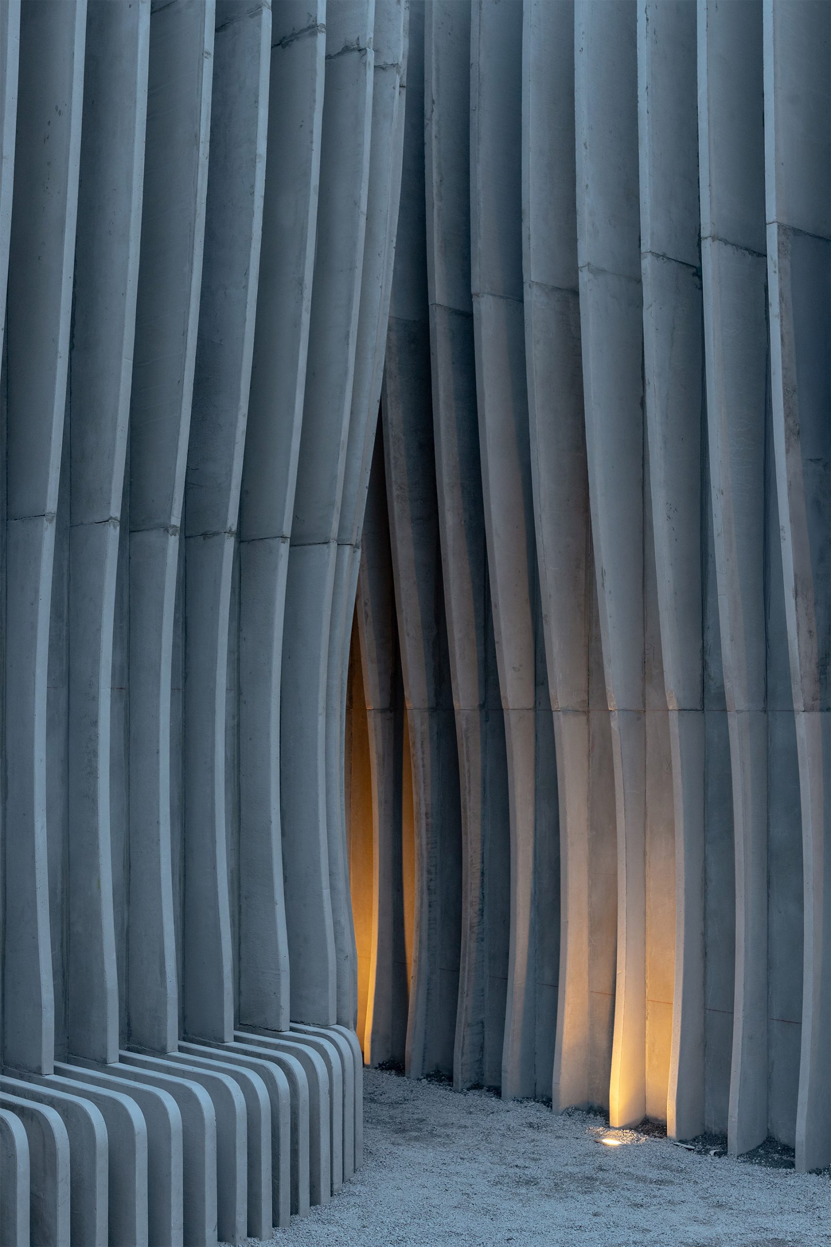Se fabricaron más de 431 piezas de hormigón diseñadas a medida para crear una fachada paramétrica concebida como una piel escultórica: un envolvente brutalista y orgánica que busca congelar el instante de la fundición y expresar el origen fluido del hormigón. Este exterior gris contrasta con los interiores vibrantes, definidos por vegetación abundante y paletas de colores dinámicas. Varios de los espacios interiores se mantuvieron abiertos al cielo, permitiendo que la luz natural, el clima y la hora del día modelen activamente la experiencia del usuario.
