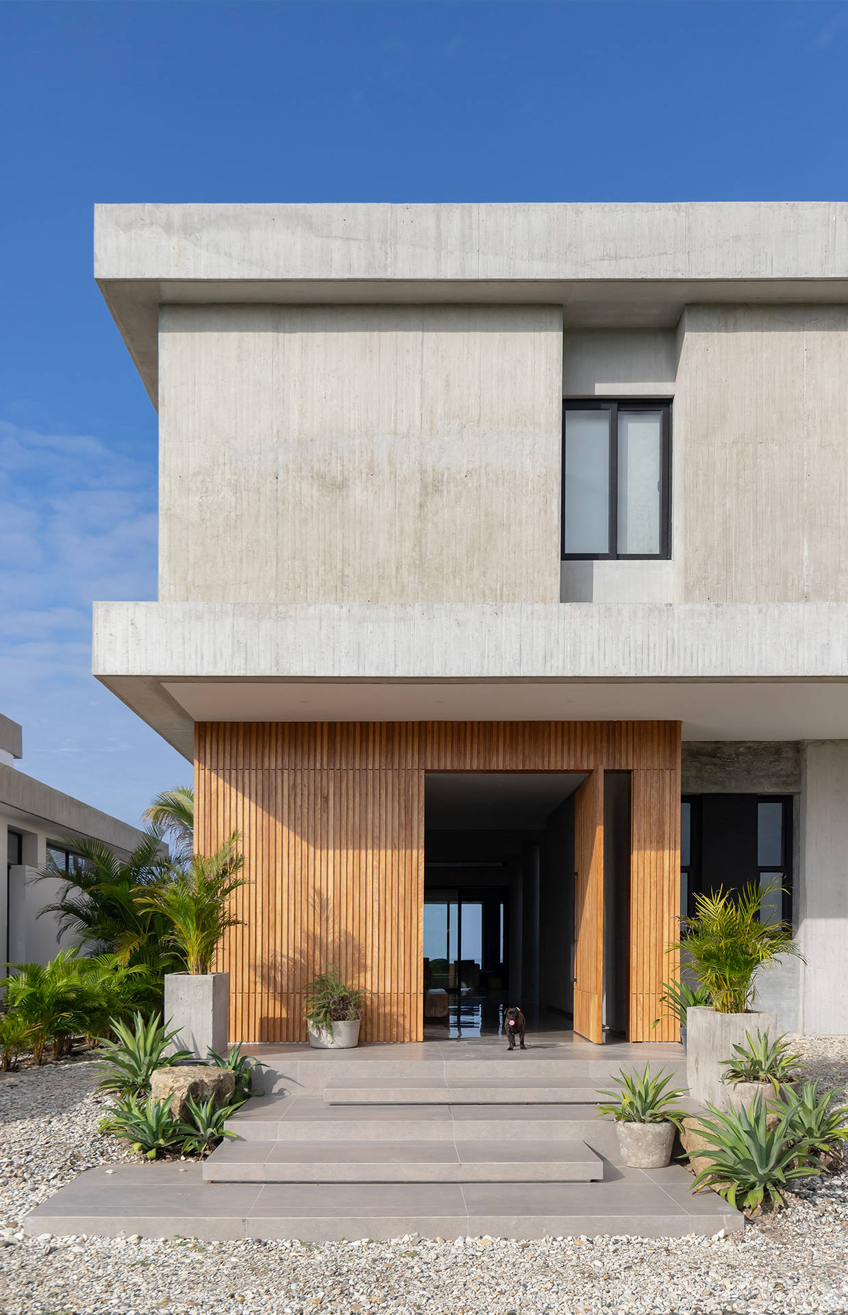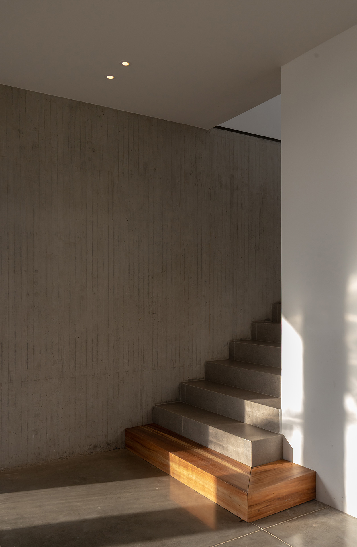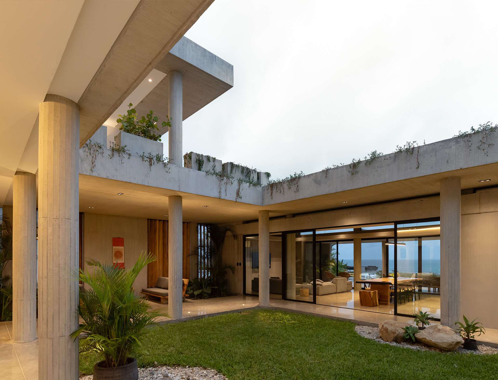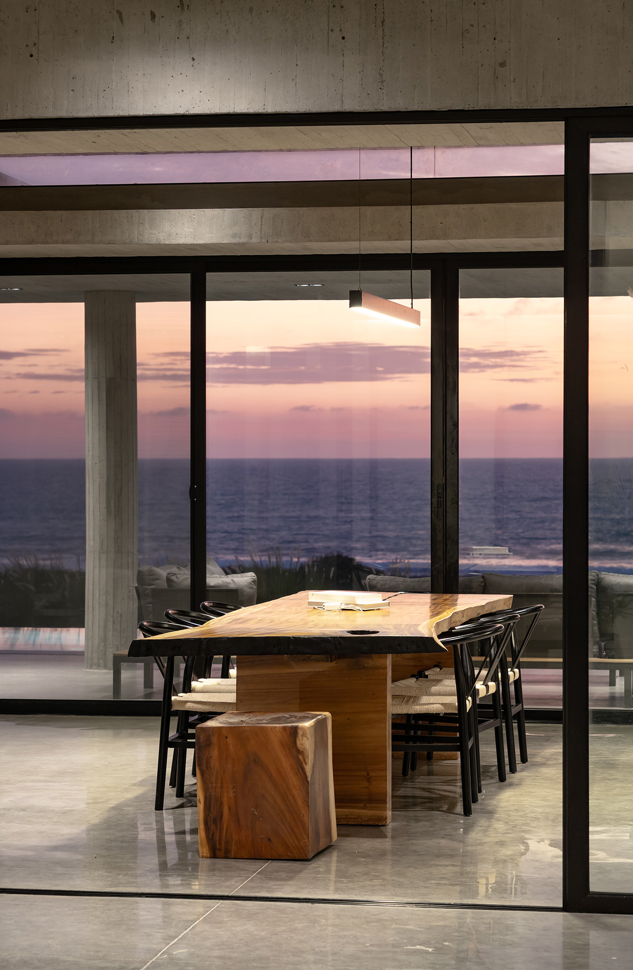 La residencia no intenta desaparecer en el sitio. Asume su condición de objeto ajeno al paisaje natural y establece un diálogo silencioso con el horizonte. La arquitectura se define por la gravedad y por el peso de la materia. El habitante no llega al océano de inmediato. El mar se revela gradualmente a medida que el usuario recorre el lugar. Los espacios se someten a compresión y expansión, sombra y luz, interior y exterior.