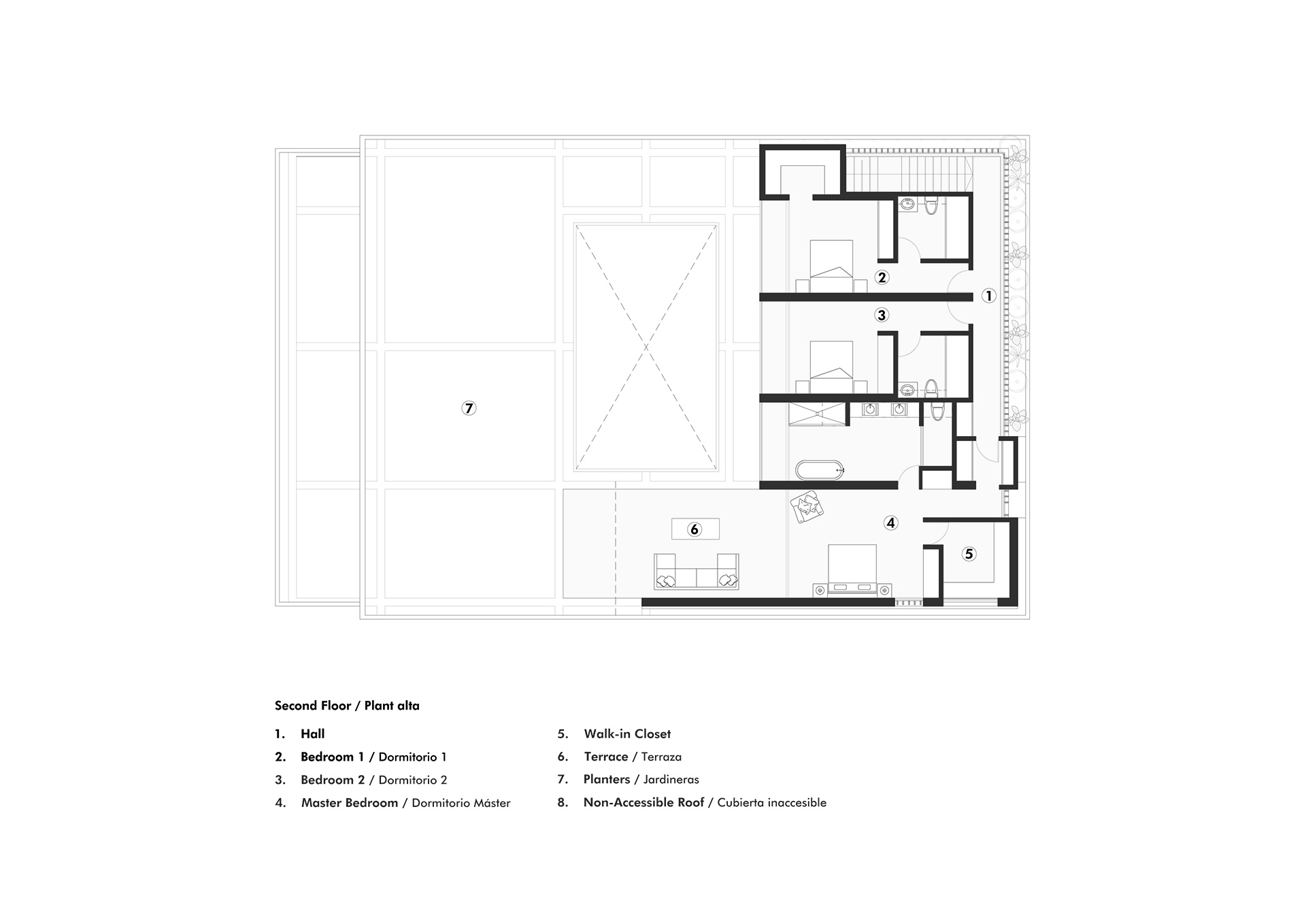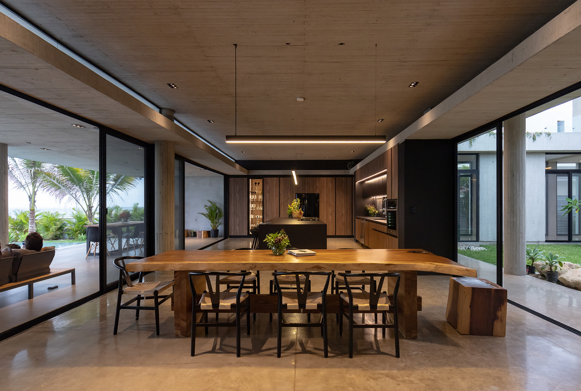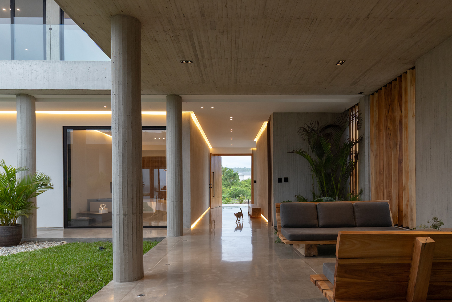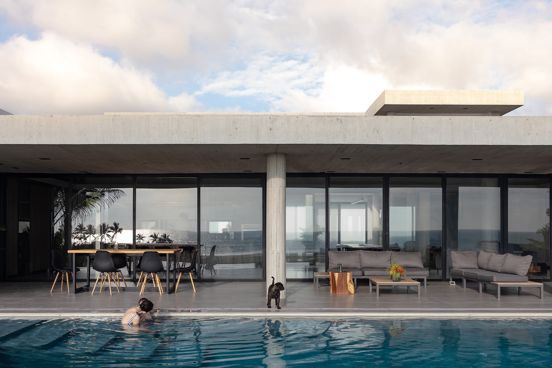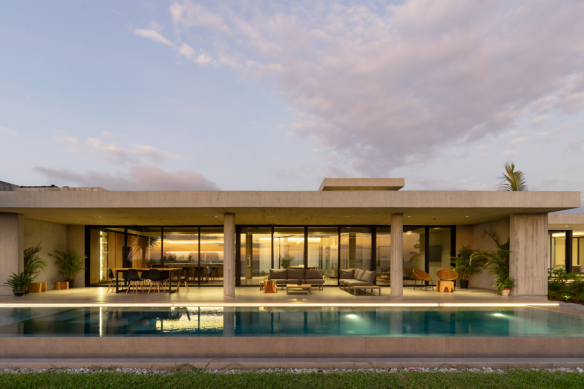 La residencia no intenta desaparecer en el sitio. Asume su condición de objeto ajeno al paisaje natural y establece un diálogo silencioso con el horizonte. La arquitectura se define por la gravedad y por el peso de la materia. El habitante no llega al océano de inmediato. El mar se revela gradualmente a medida que el usuario recorre el lugar. Los espacios se someten a compresión y expansión, sombra y luz, interior y exterior.