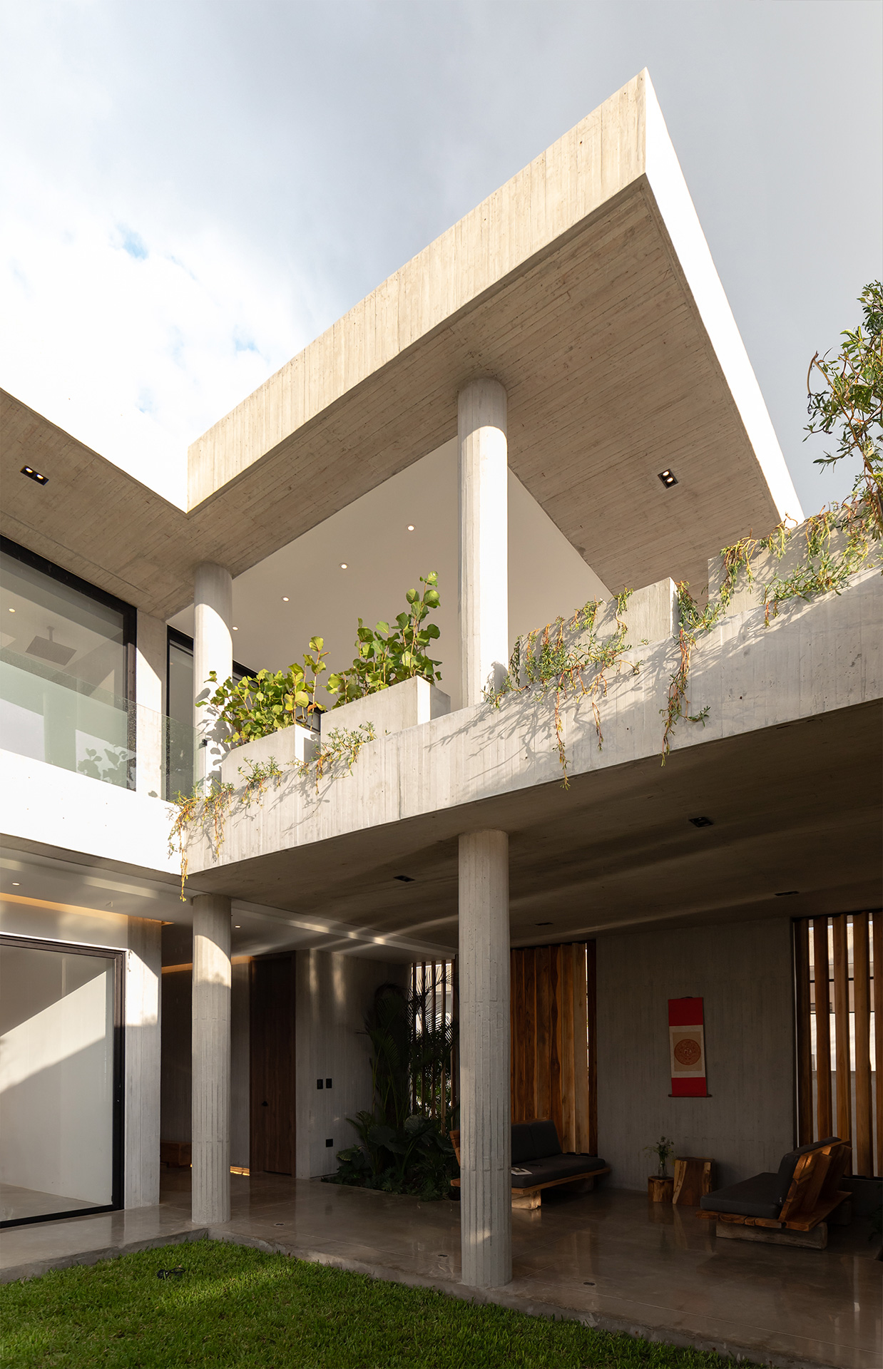 Los volúmenes pesados se convierten en el principal lenguaje arquitectónico. La casa está construida casi en su totalidad en hormigón visto, no tratado como una superficie lisa, sino que sus paredes y techos son rugosos como un registro de su propia ejecución. Las tablas de encofrado de madera dejan su veta, juntas e imperfecciones impresas en muros, techos y pisos. Estas marcas no se ocultan. Son el proyecto mismo. La arquitectura, por tanto, no solo se diseña, se construye artesanalmente.