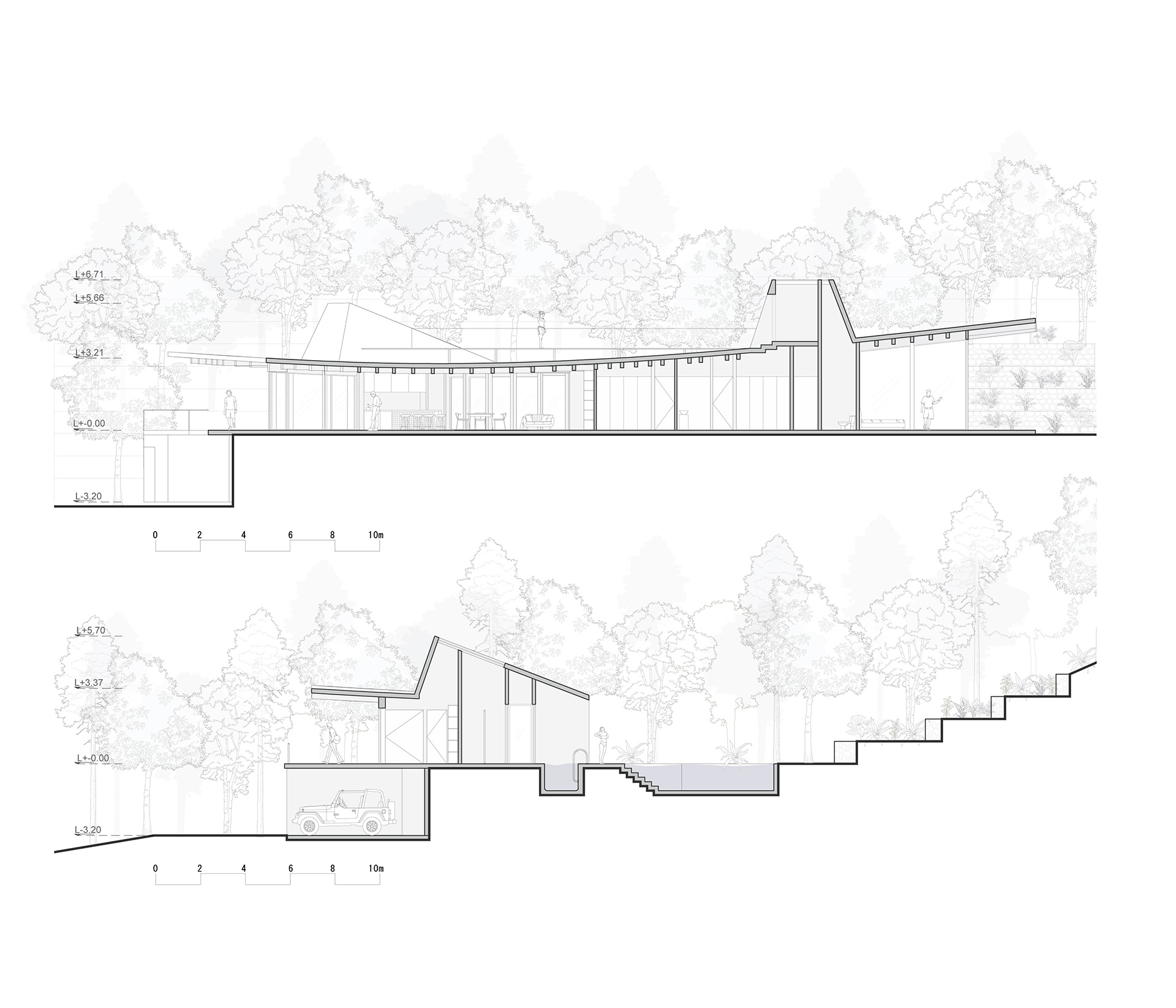 El proyecto se concibe como un refugio horizontal arraigado al terreno, atravesado por volúmenes pétreos que abstraen la presencia de la montaña y reintroducen la silueta de la cresta en la arquitectura. Más que imitar el paisaje, la propuesta traduce la condición geológica de Yakushima a un lenguaje tectónico en el que la habitación y la topografía se vuelven inseparables.