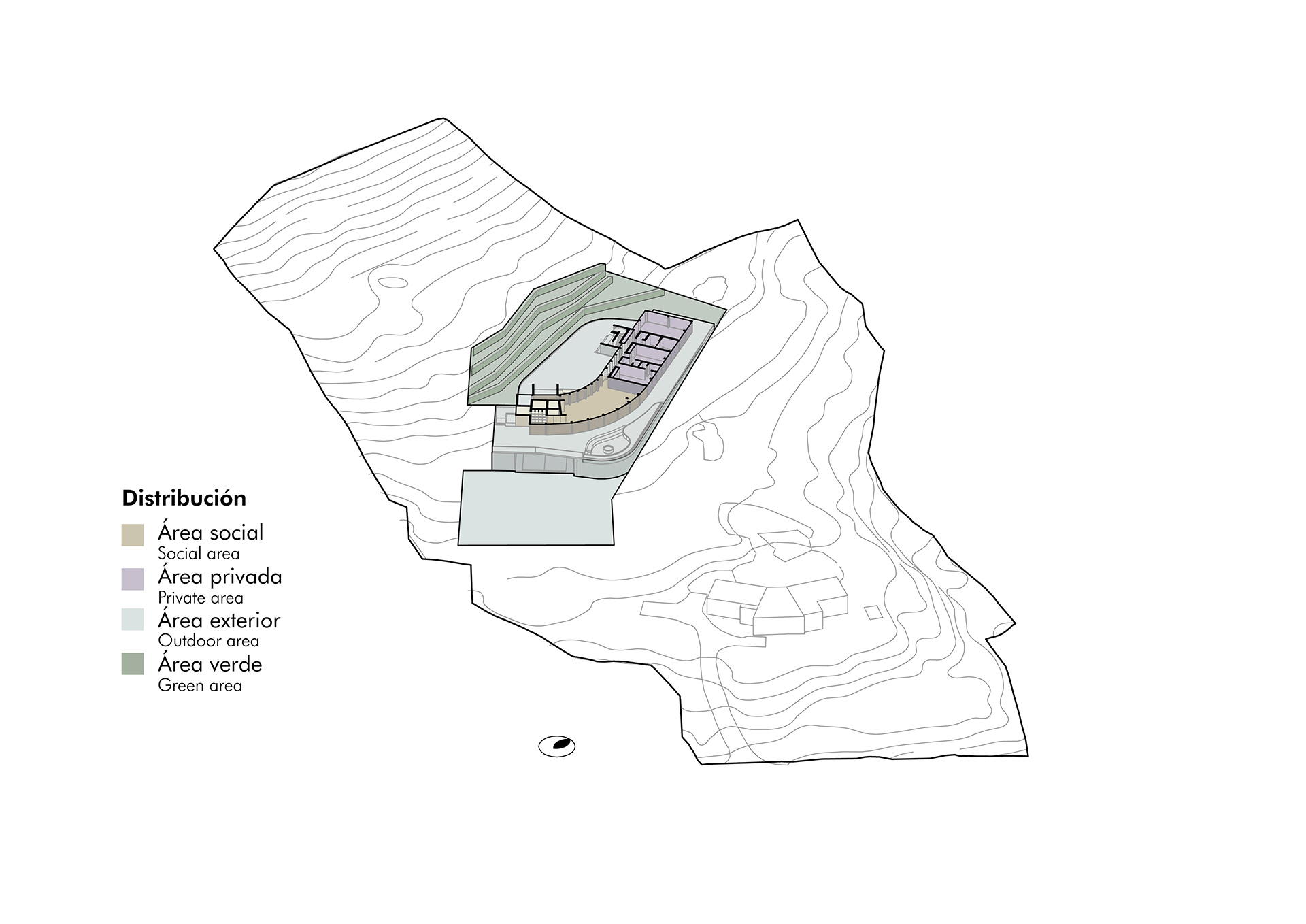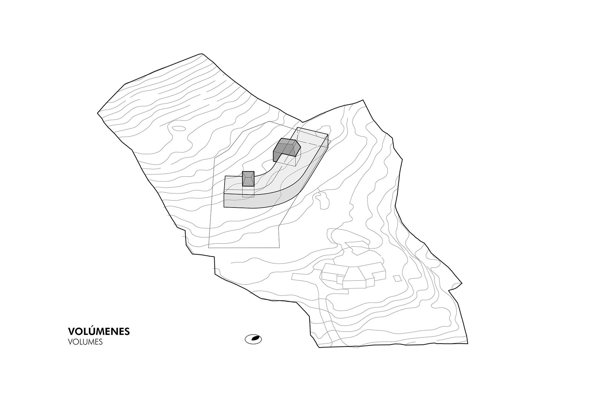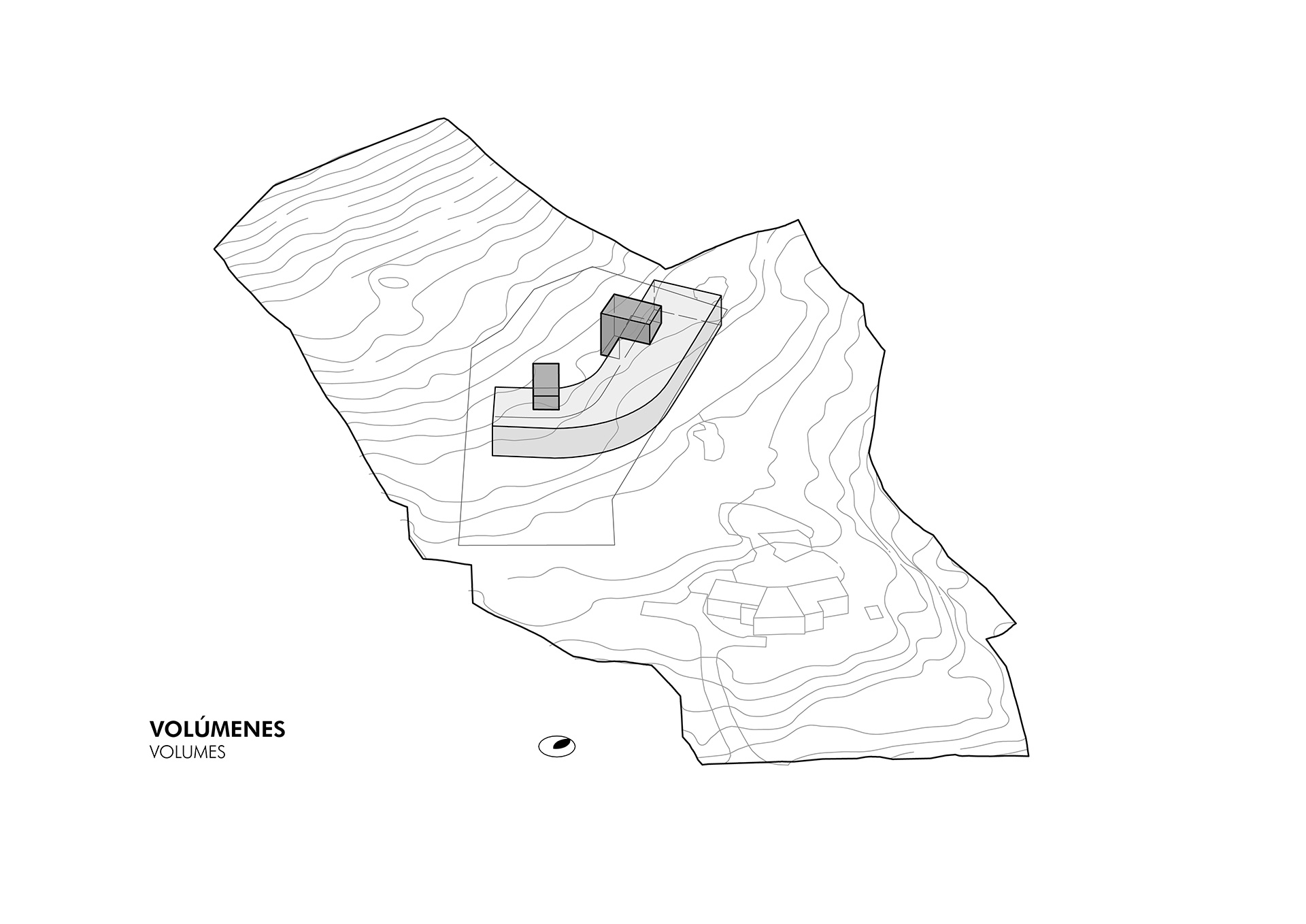 Este concepto da forma a un volumen horizontal contenido, que se adapta a la pendiente natural y se integra a la ladera, priorizando la inserción en el lugar por sobre la imposición formal. Elementos verticales de piedra interrumpen esta continuidad y establecen un diálogo directo entre los espacios habitables y la masa de la montaña, anclando la arquitectura —tanto física como simbólicamente— al territorio....