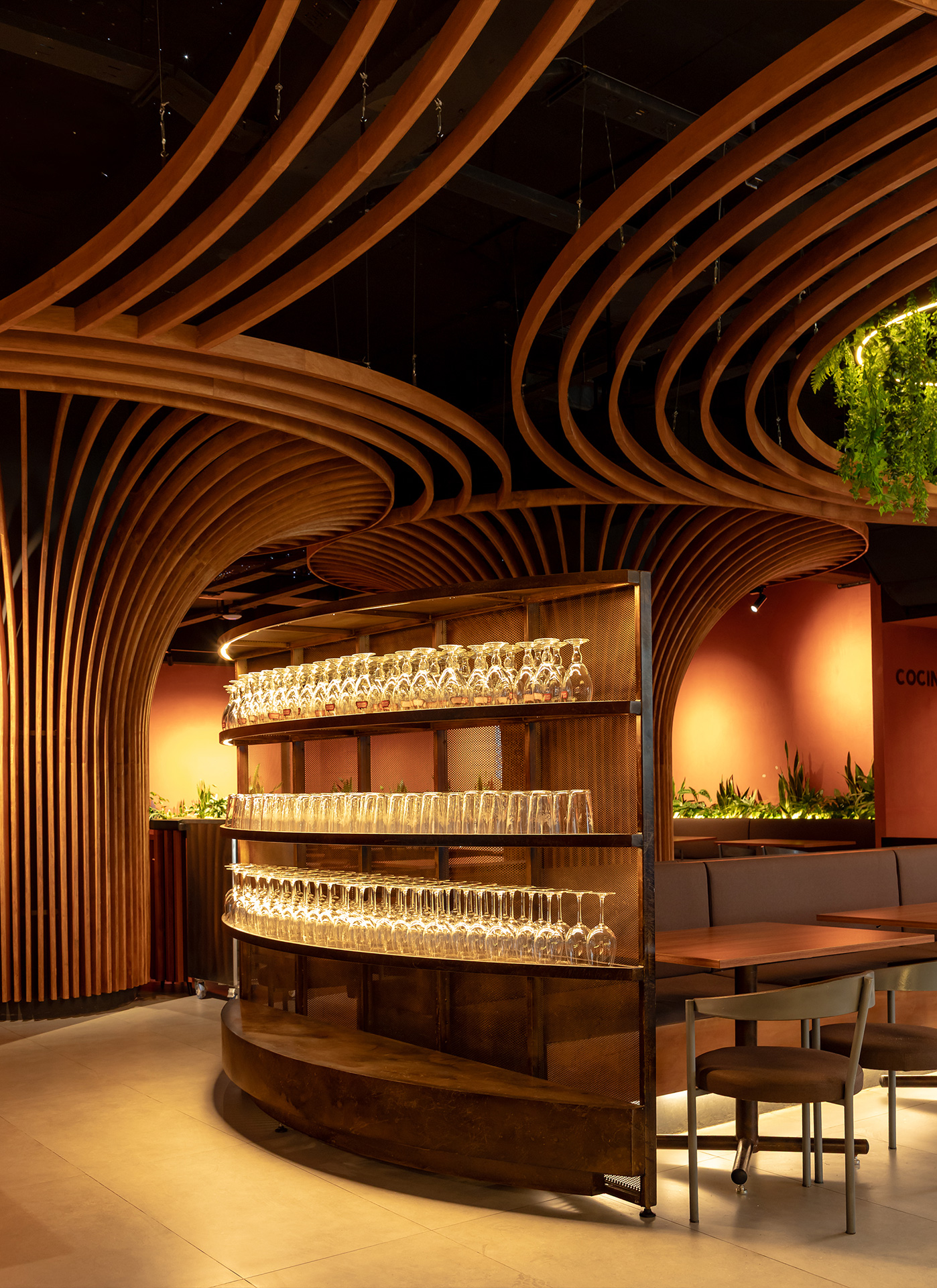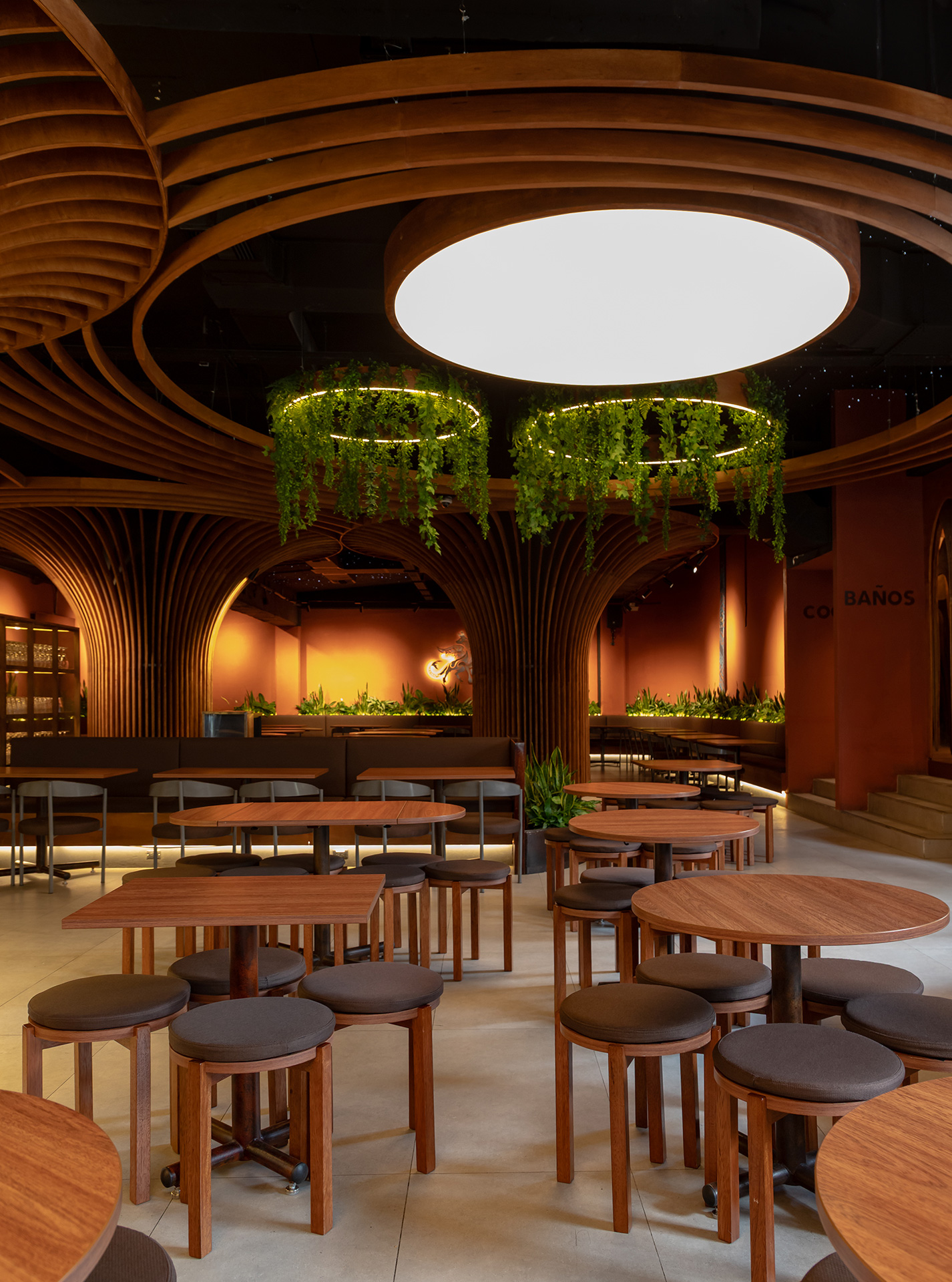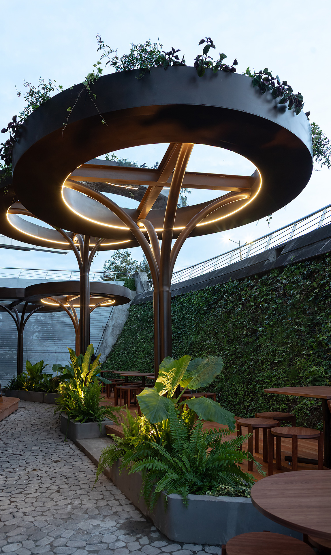 El mismo lenguaje de diseño se extiende al exterior, donde las islas de servicio se transforman en estructuras metálicas que emergen como árboles desde las jardineras. Sus copas sostienen vegetación colgante que brinda sombra y genera espacios íntimos para el encuentro.