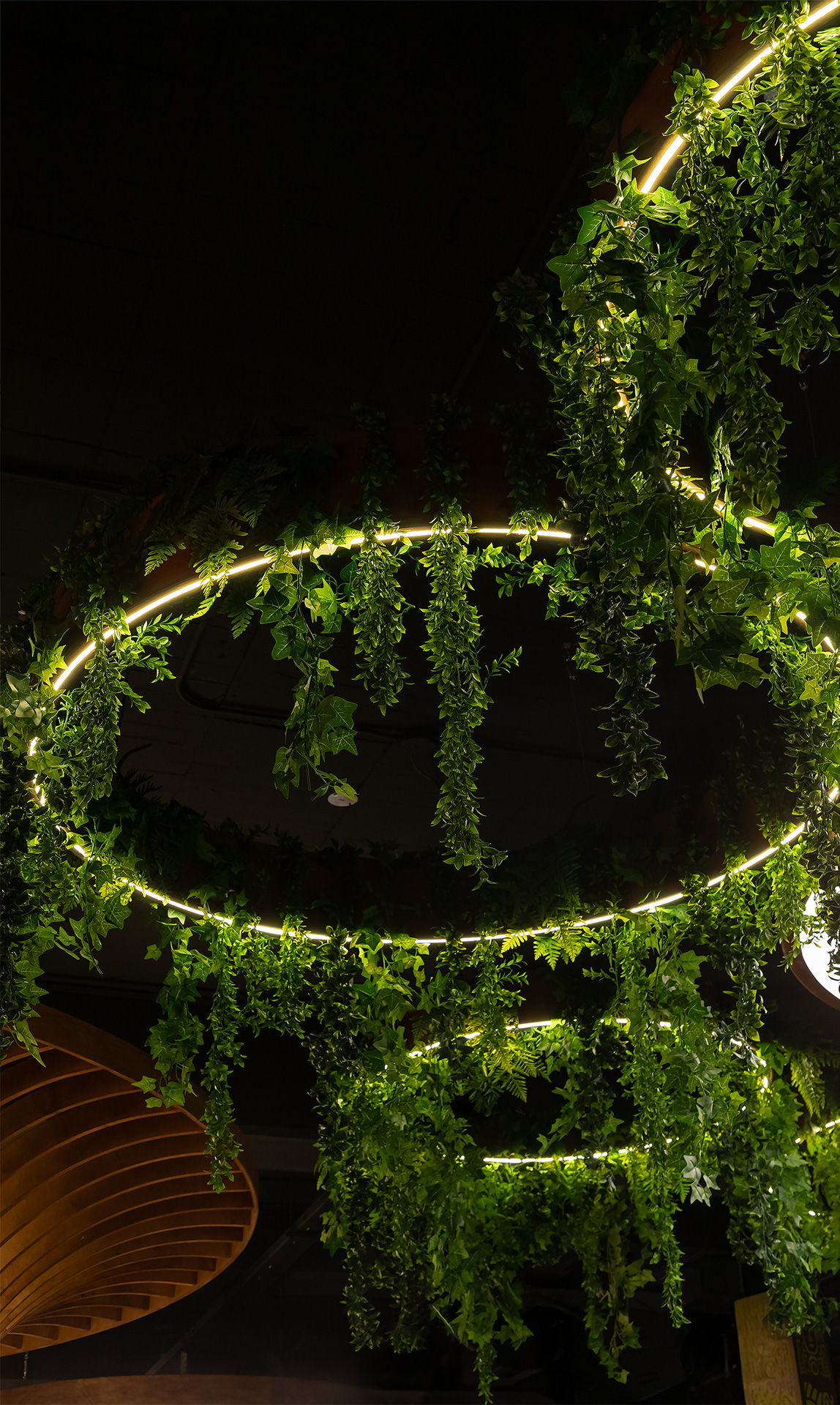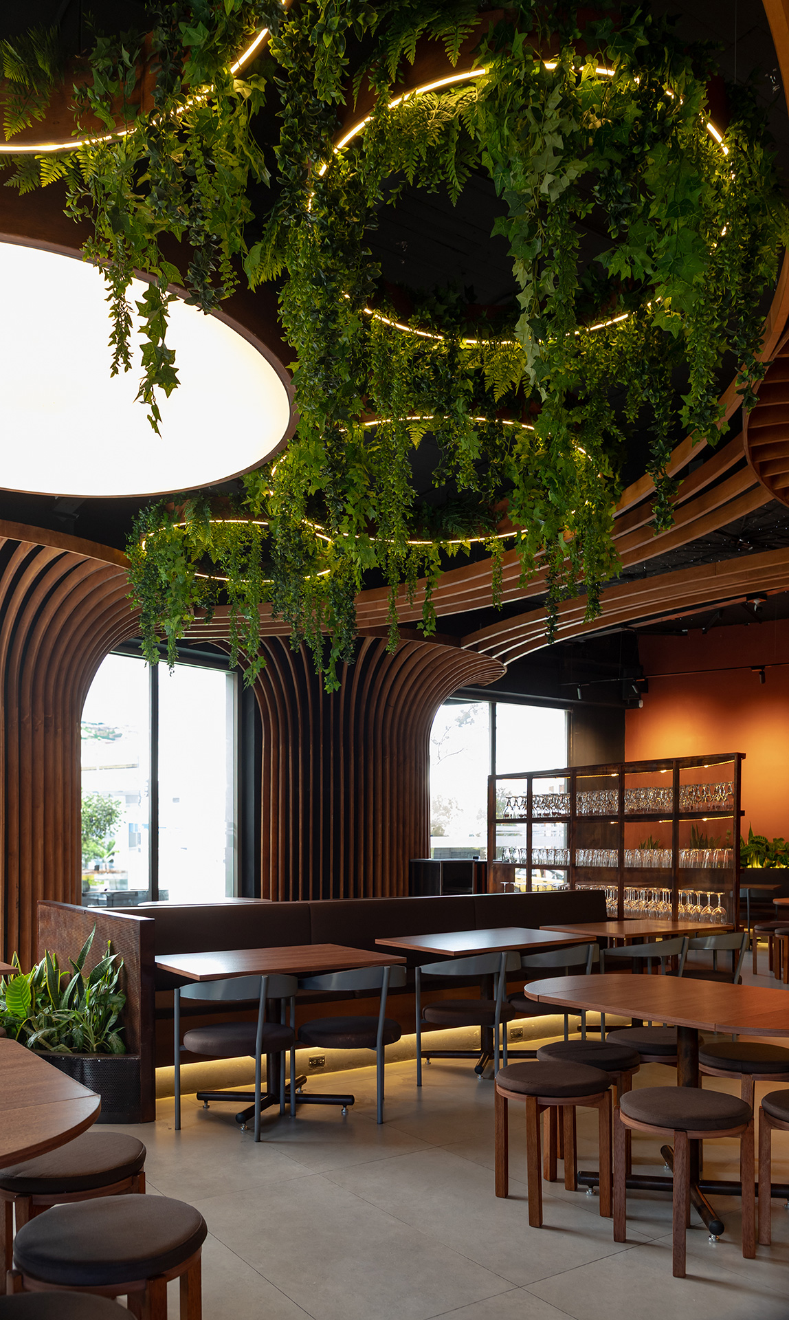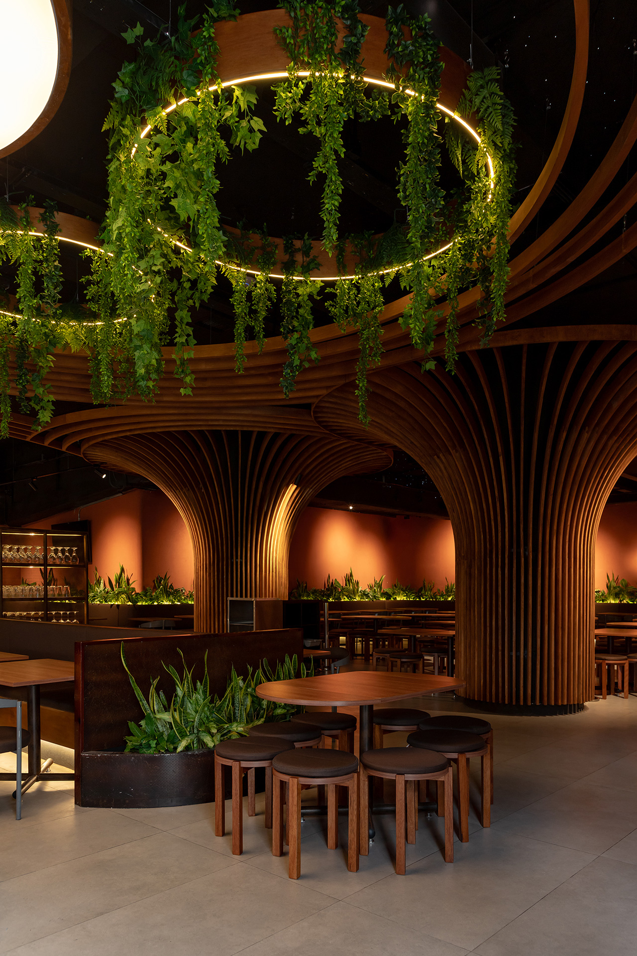 El mismo lenguaje de diseño se extiende al exterior, donde las islas de servicio se transforman en estructuras metálicas que emergen como árboles desde las jardineras. Sus copas sostienen vegetación colgante que brinda sombra y genera espacios íntimos para el encuentro.