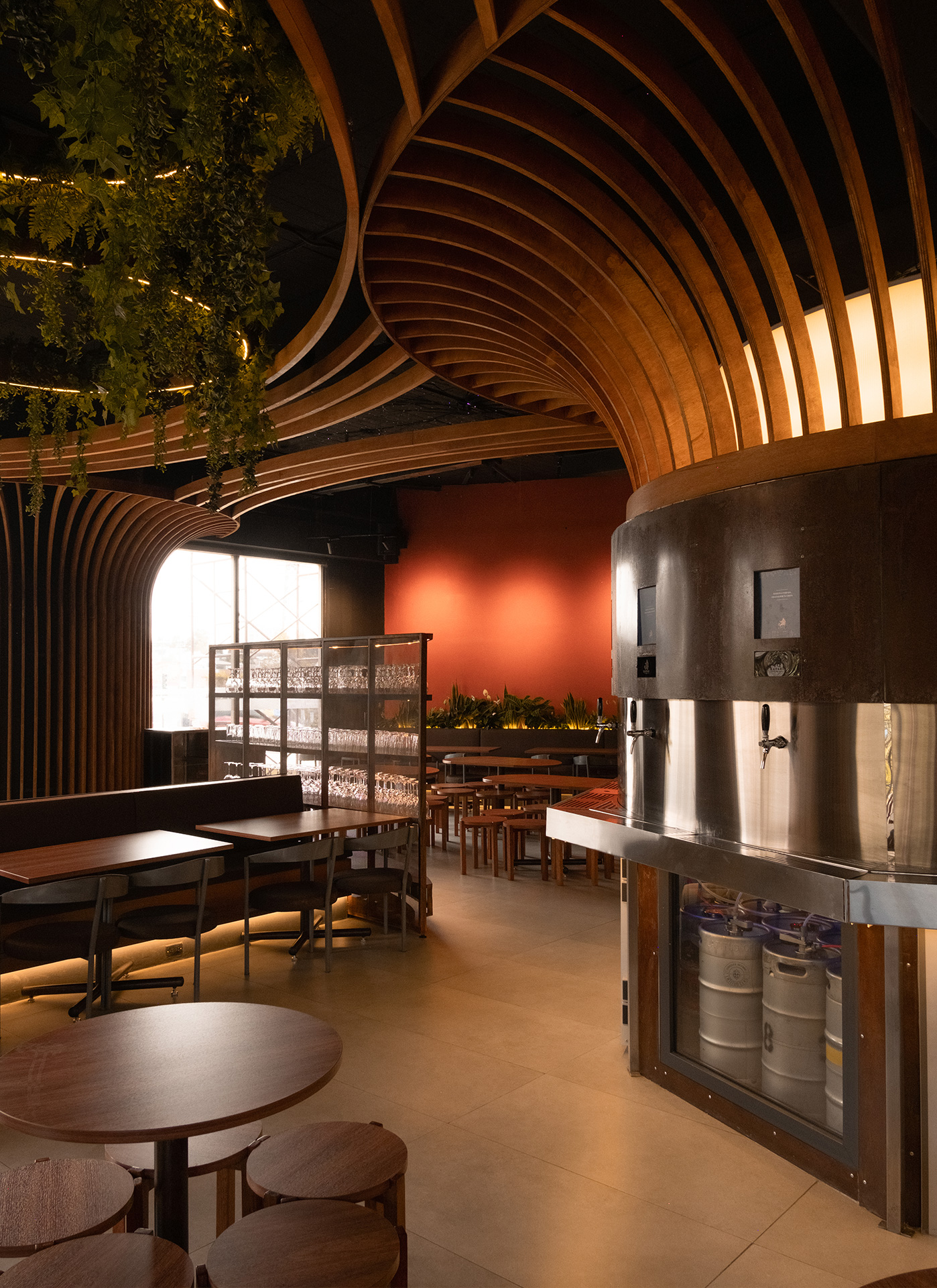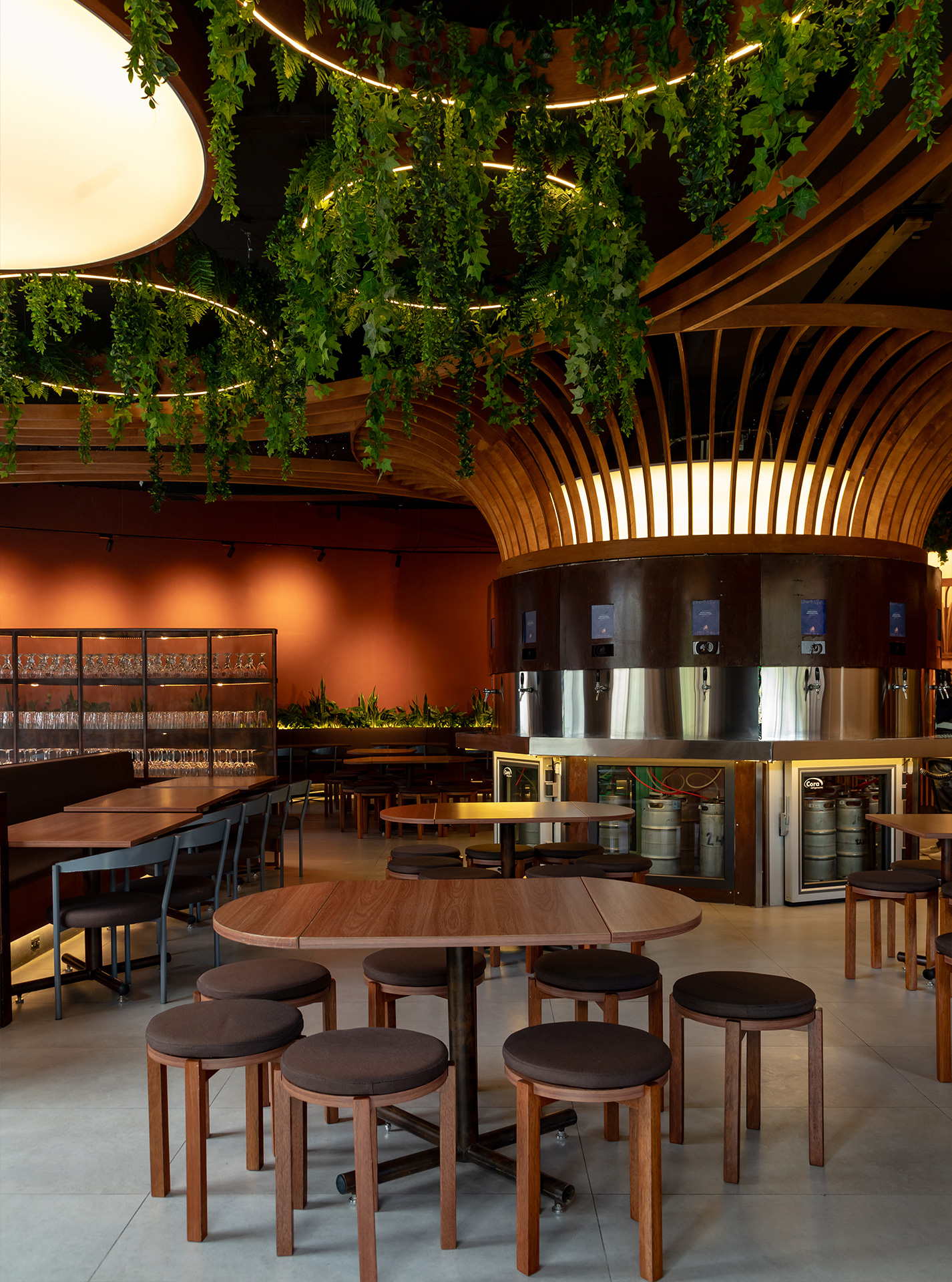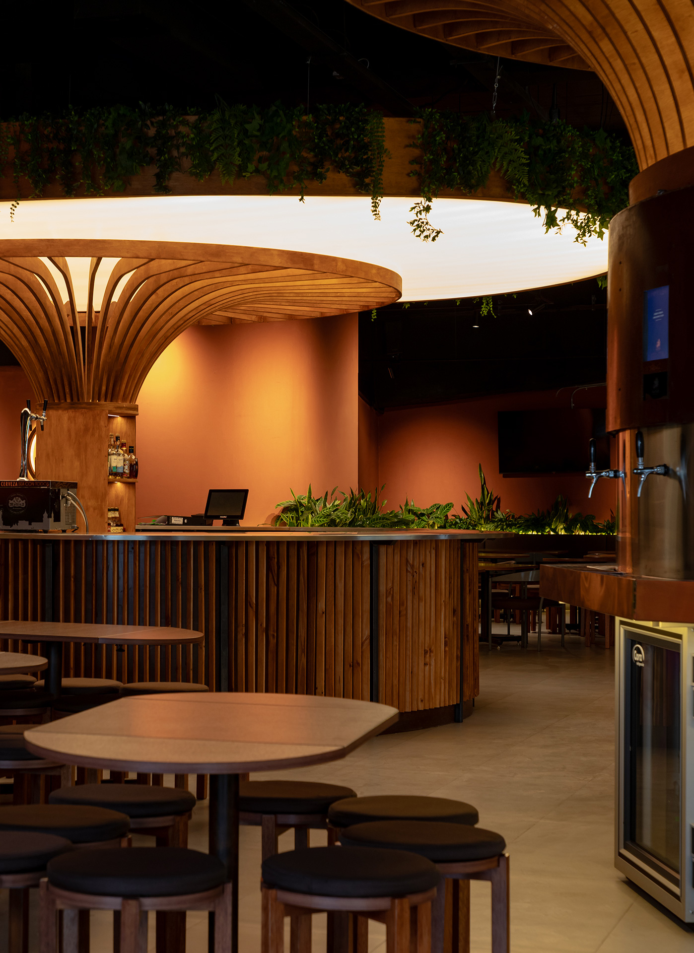 Como homenaje a la cerveza, las máquinas dispensadoras se ubicaron en el corazón del proyecto. En lugar de esconderse, fueron concebidas como elementos escultóricos centrales, integrados en islas de servicio que estructuran el espacio y organizan la interacción con el usuario.